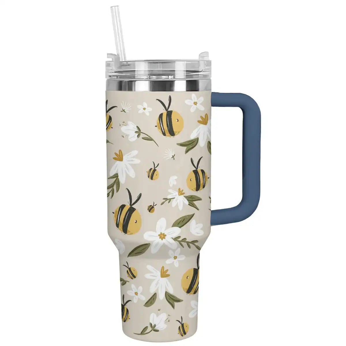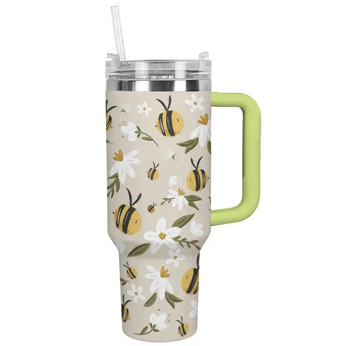 Stay refreshed on the go with this charming bee and daisy travel mug. Its double-wall insulation keeps drinks hot or cold for hours.