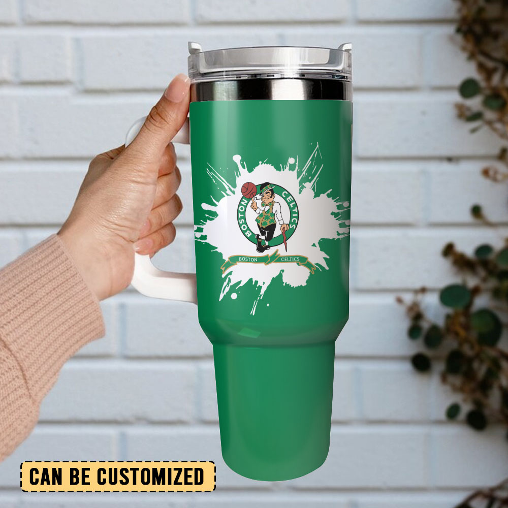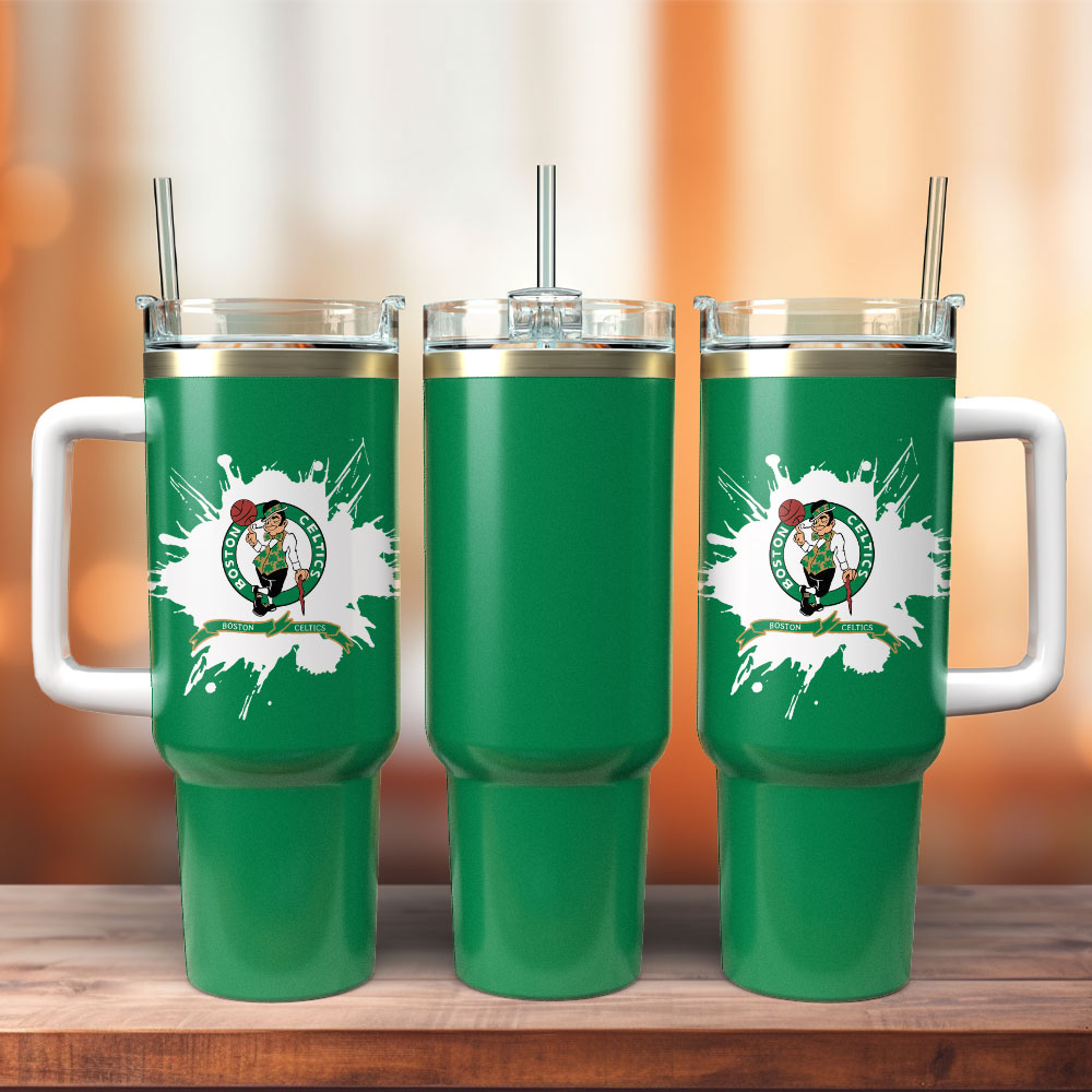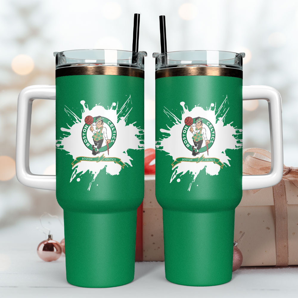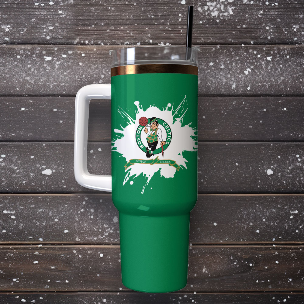 Show your team pride with this insulated Boston basketball tumbler. Perfect for hot or cold drinks on the go. Durable and stylish design.