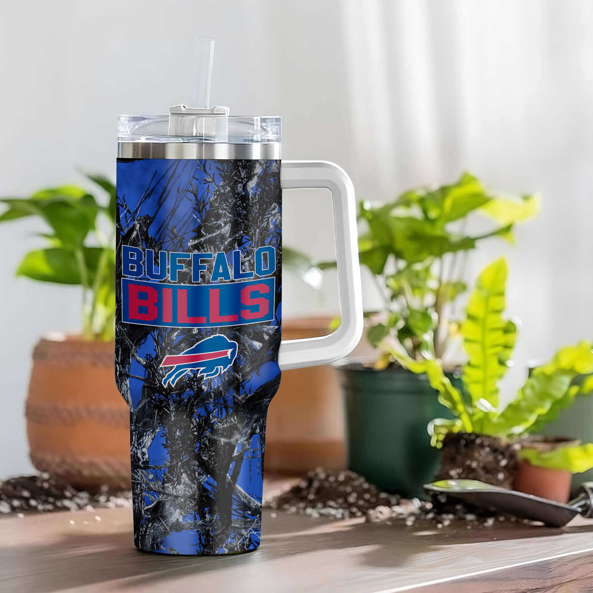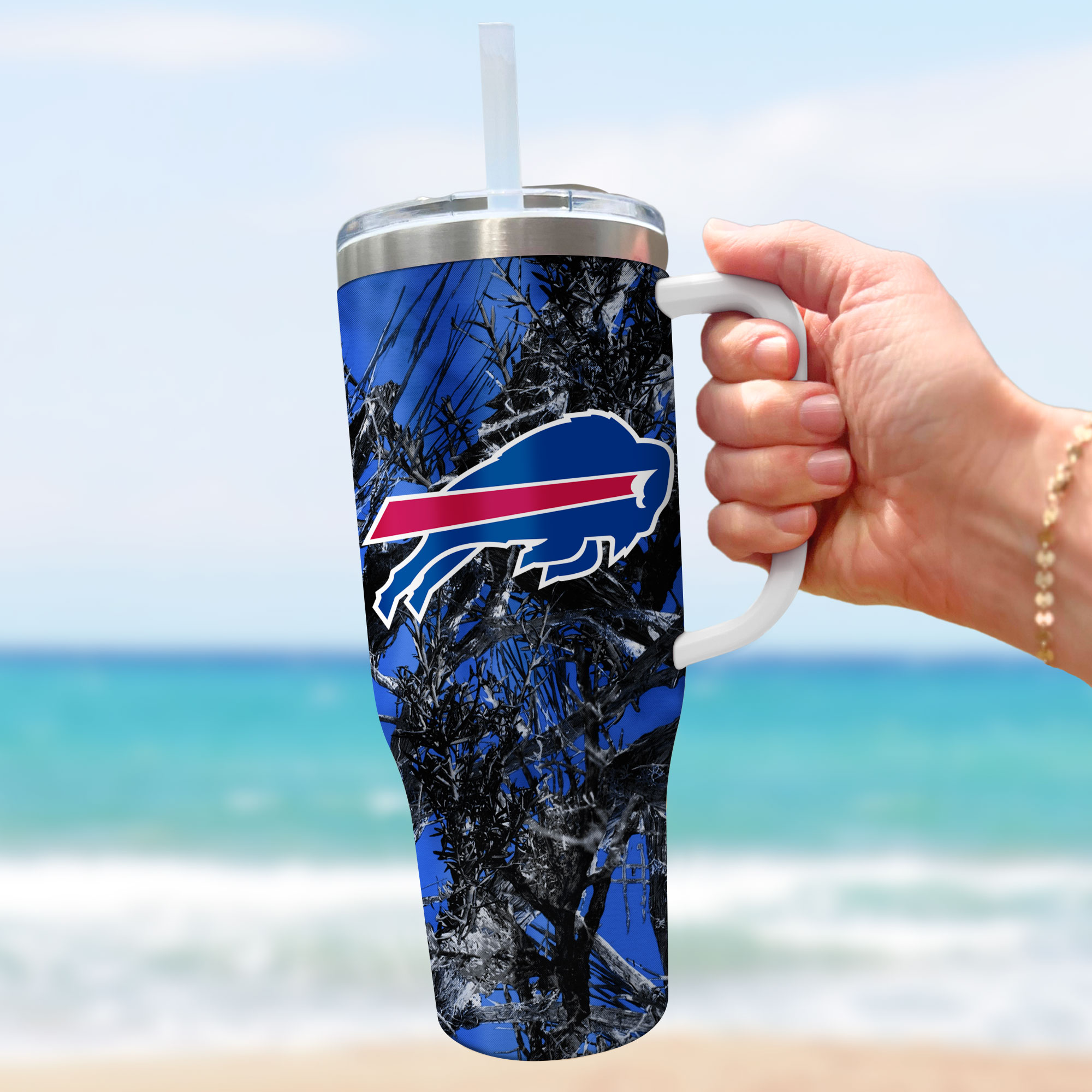 Stay hydrated in style with this 24oz Buffalo Bills camo tumbler. Features a secure lid, handle, and straw for easy sipping on the go.