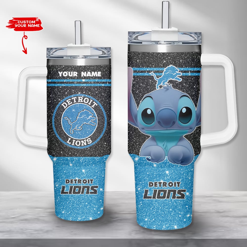 Show off your team spirit with this personalized Detroit Lions tumbler featuring a fun Stitch design. Perfect for keeping your drinks hot or cold on the go.