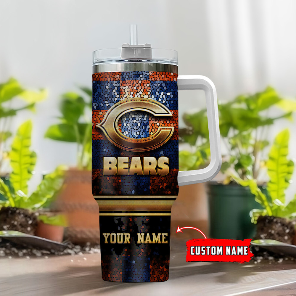 Stay refreshed and show your team pride with this customizable Bears tumbler. Perfect for hot or cold drinks, featuring a sturdy handle and personalized name.