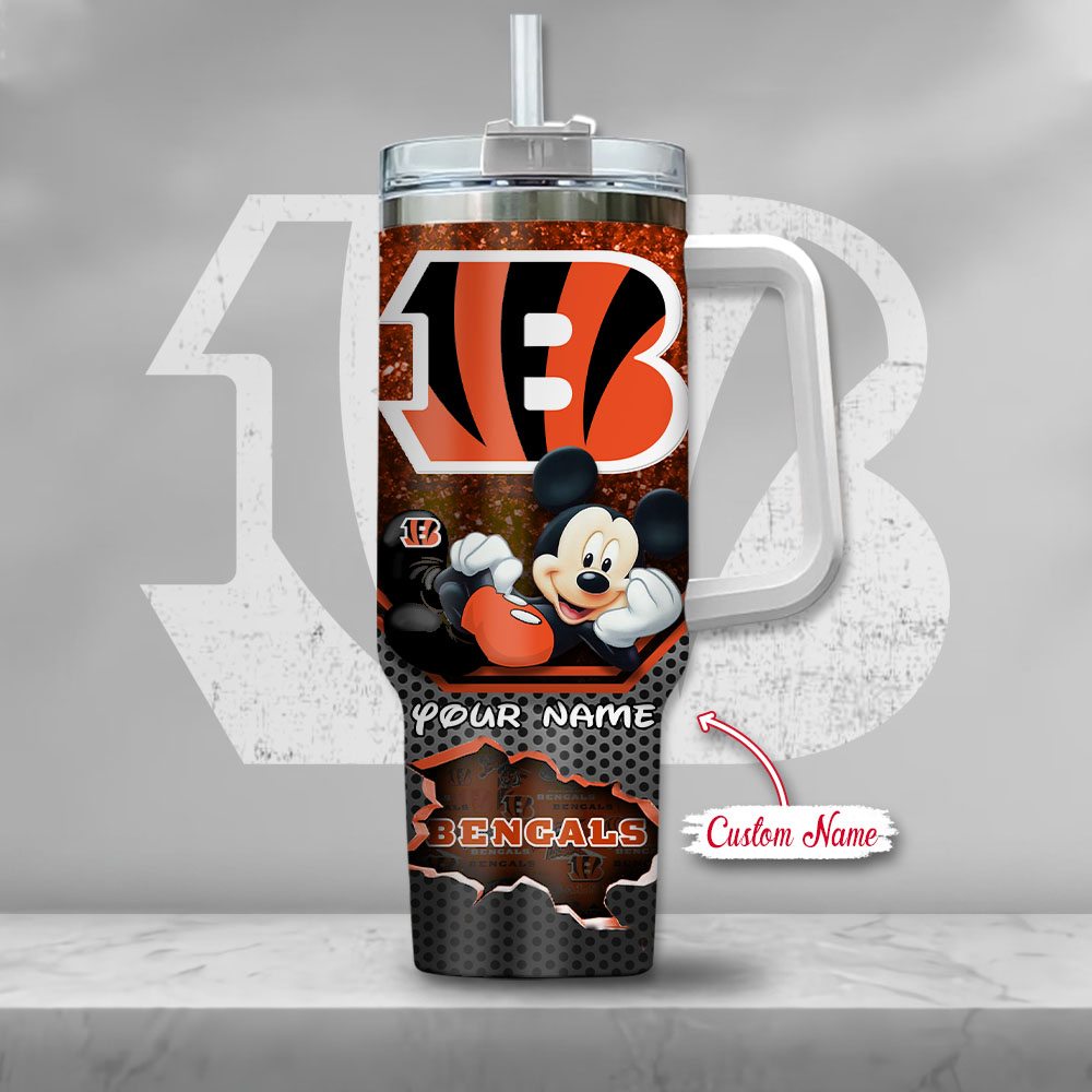 Show your team spirit with this custom Bengals tumbler featuring a fun Mickey design. Perfect for game days or as a personalized gift.