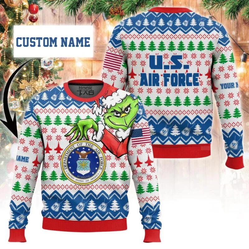 Custom Name Grinch x US Air Force Ugly Christmas Sweater, Grinch Holiday Sweater