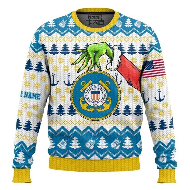 Custom Name Grinch x US Coast Guard Ugly Sweater, Grinch Holiday Sweater