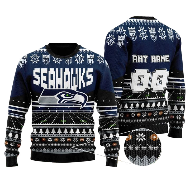 Custom Name Number Nfl Seattle Seahawks Rugby Stadium Ugly Christmas Sweater