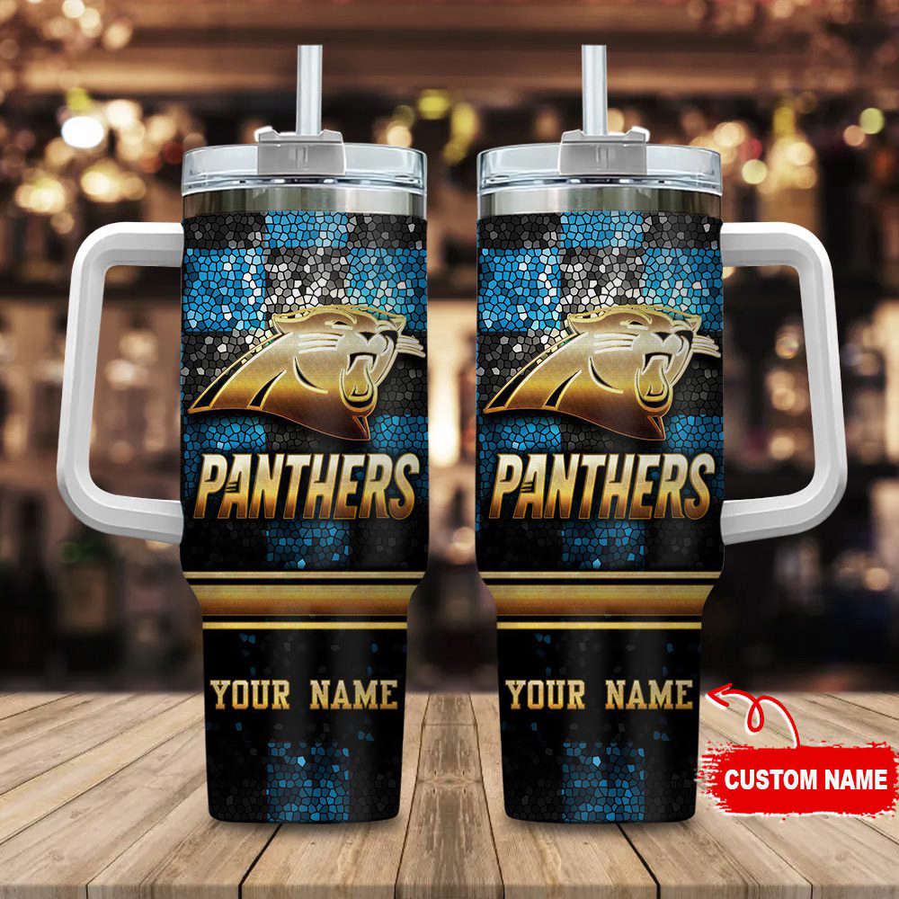 Stay refreshed with this customizable Panthers tumbler. Features a straw, handle, and your name for a personalized touch. Perfect for fans on the go!