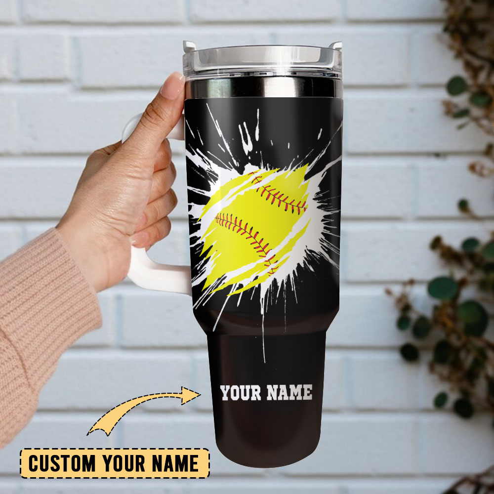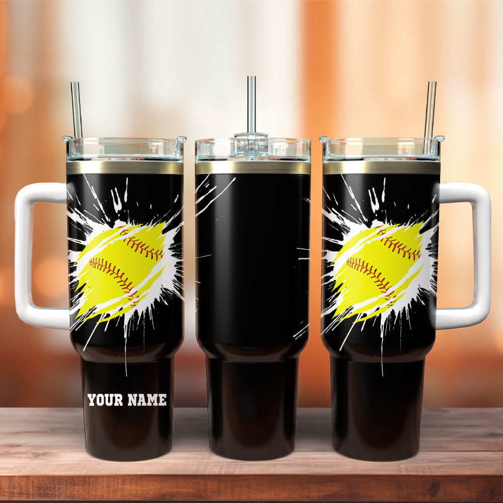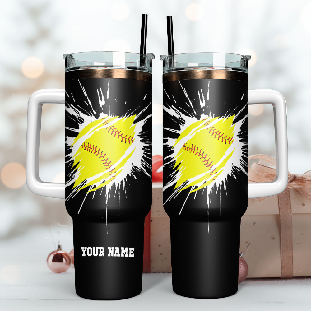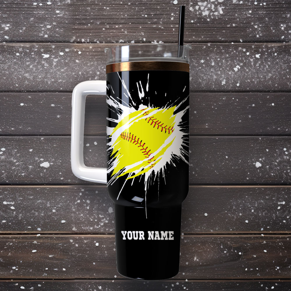 Stay hydrated and show your love for softball with this customizable tumbler. Features a sturdy handle, straw, and vibrant softball design. Perfect gift!
