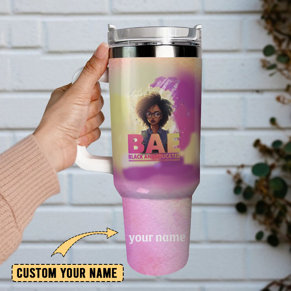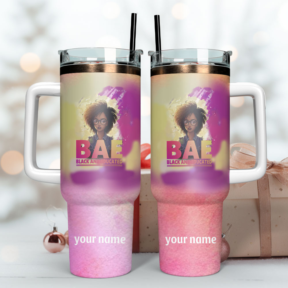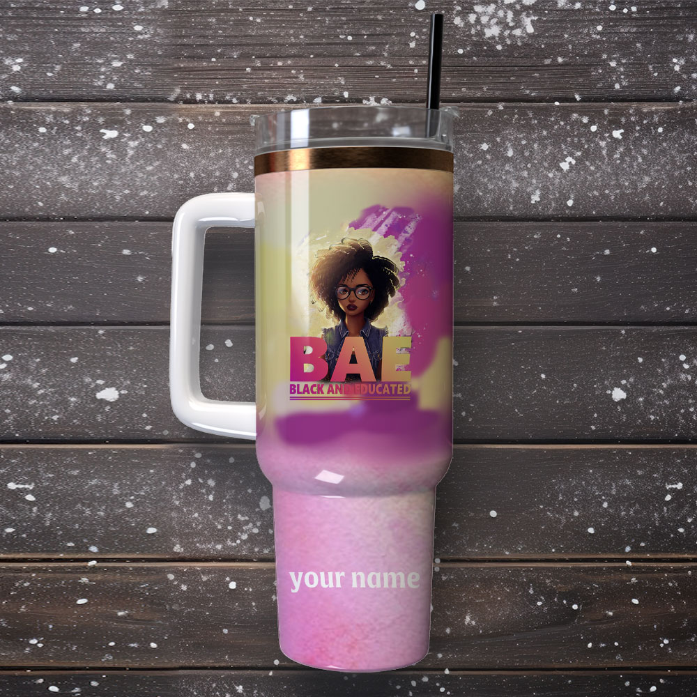 Stay hydrated in style with this customizable BAE tumbler. Perfect for expressing pride and sipping on the go, featuring a handle and straw.