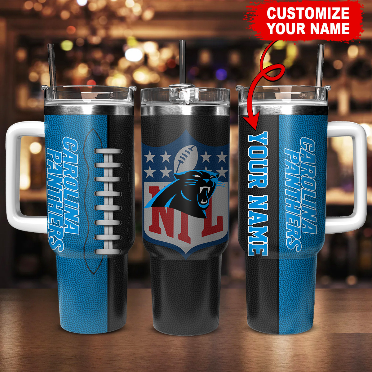 Cheer for the Carolina Panthers with this customized tumbler! Perfect for fans, this durable drinkware keeps beverages hot or cold. Add your name for a personal touch.