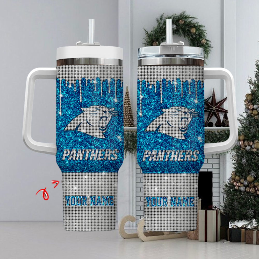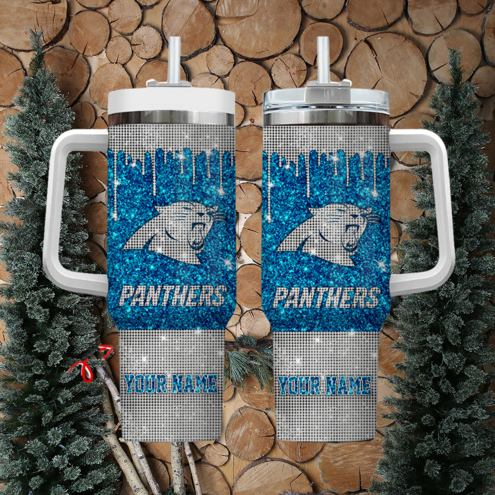 Stay hydrated in style with this personalized Panthers glitter tumbler. Perfect for fans, it features a secure lid and handle for easy carrying.