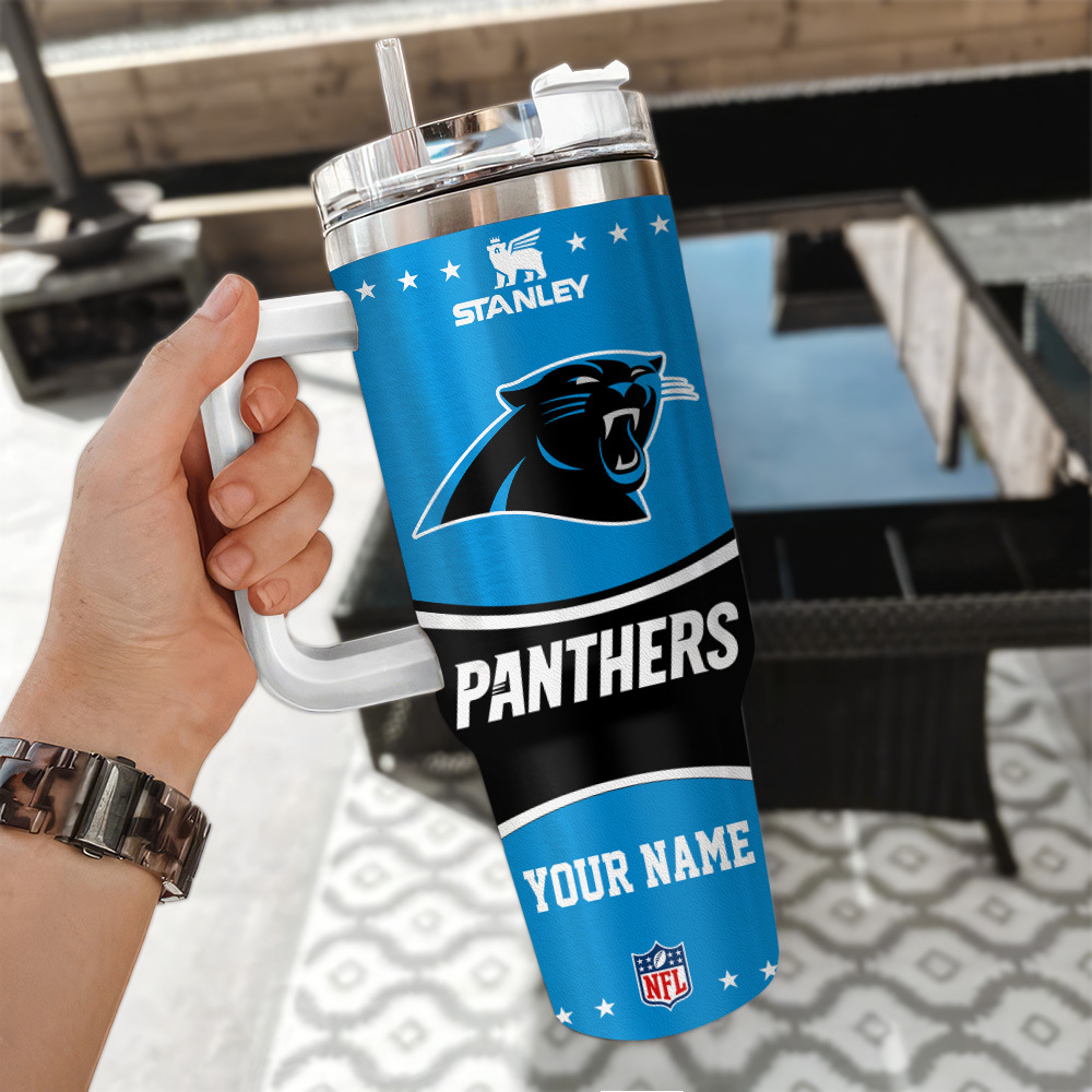 Show your team spirit with this customizable Panthers Stanley tumbler. Add your name and enjoy your favorite drink on the go!