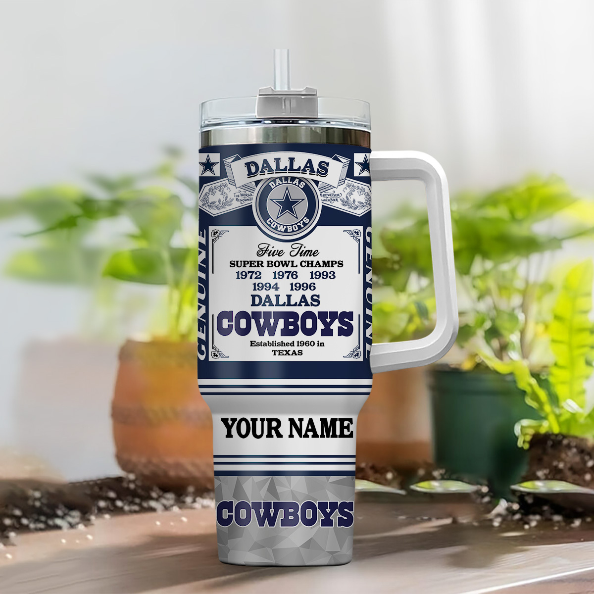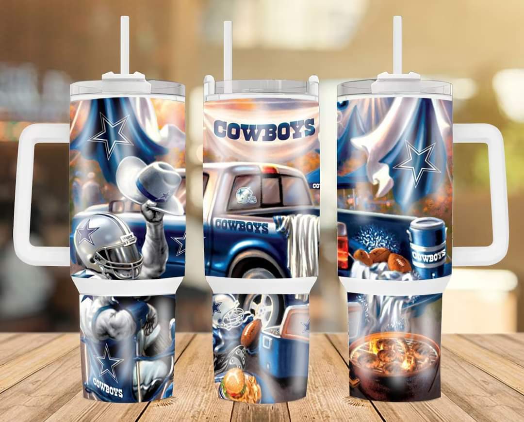 Show your team pride with this Dallas Cowboys fan mug. Perfect for game days, this tumbler features a handle and straw for convenient sipping.