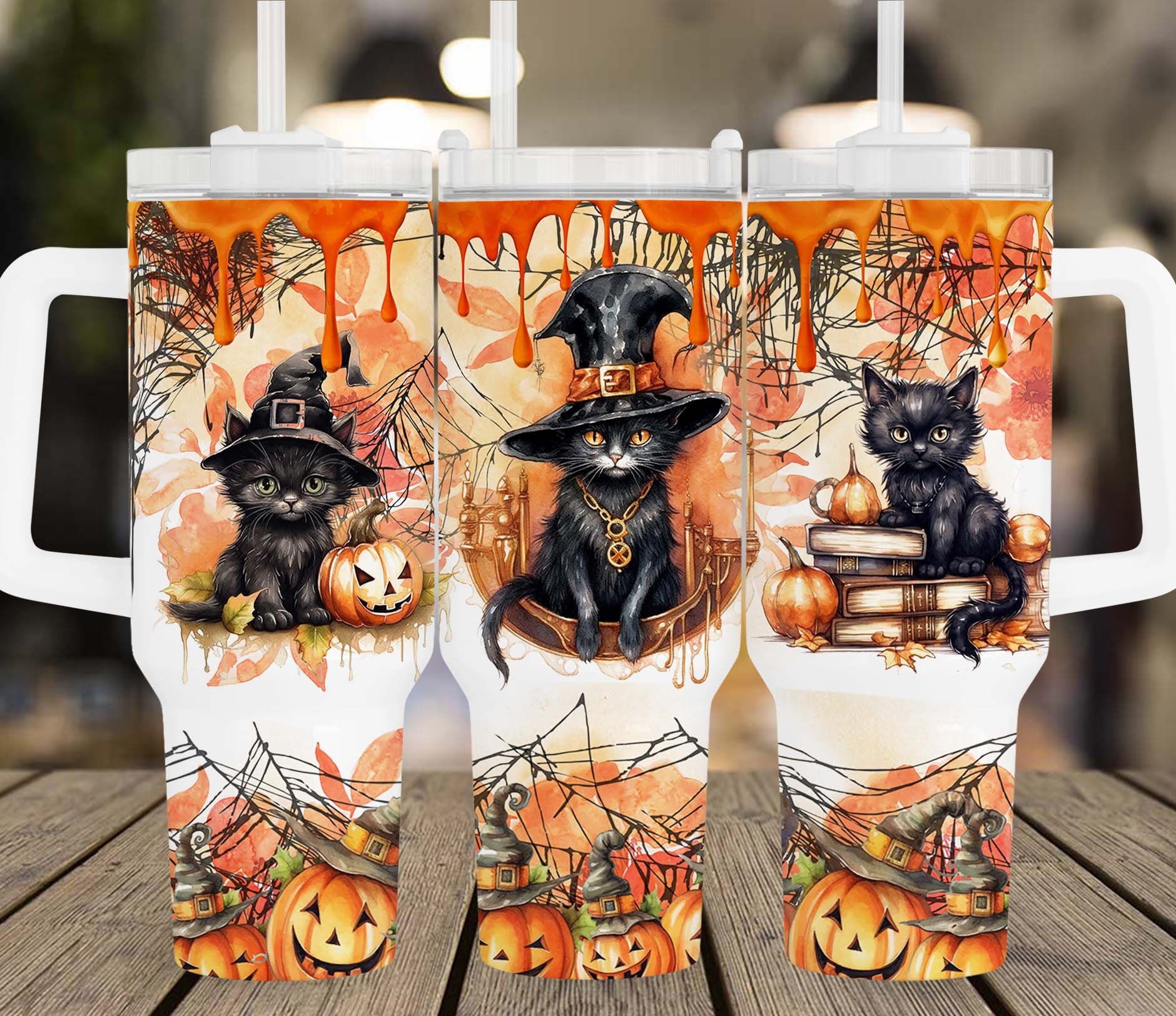 Sip in style with this Halloween-themed tumbler featuring adorable black cats, pumpkins, and witch hats. Perfect for your festive drinks!