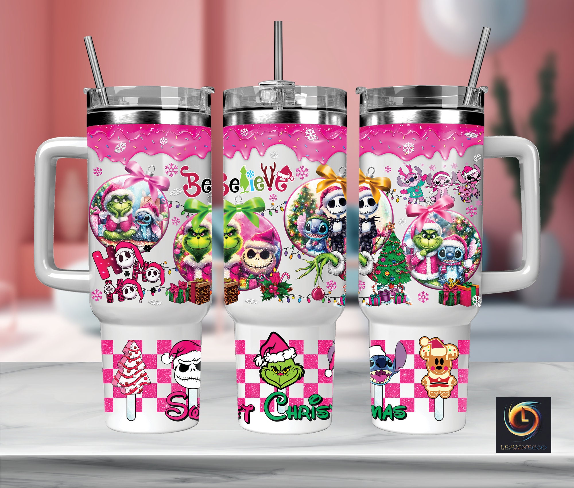 Celebrate the holidays with this vibrant tumbler featuring beloved festive characters. Perfect for hot or cold drinks, it comes with a handle and straw for easy sipping.