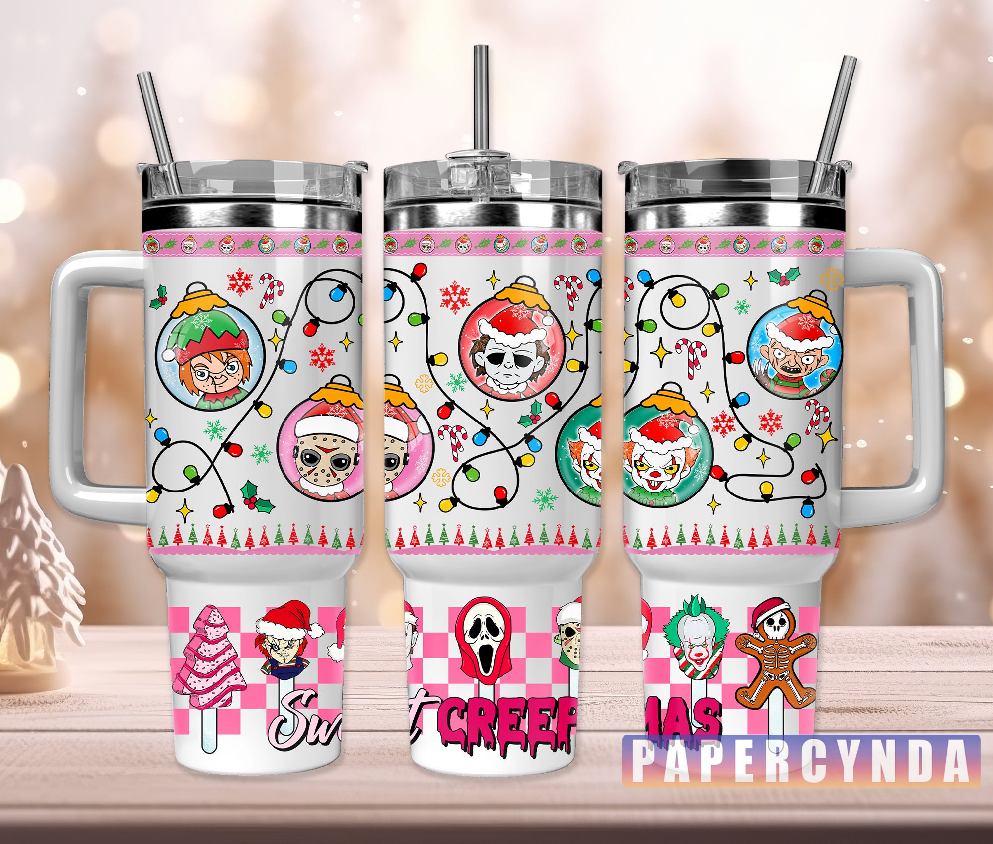 Celebrate the holidays with a unique twist! This horror-themed Christmas tumbler features festive designs with a touch of spooky fun. Comes with a straw and handle for easy sipping. Ideal for holiday parties and gifts.