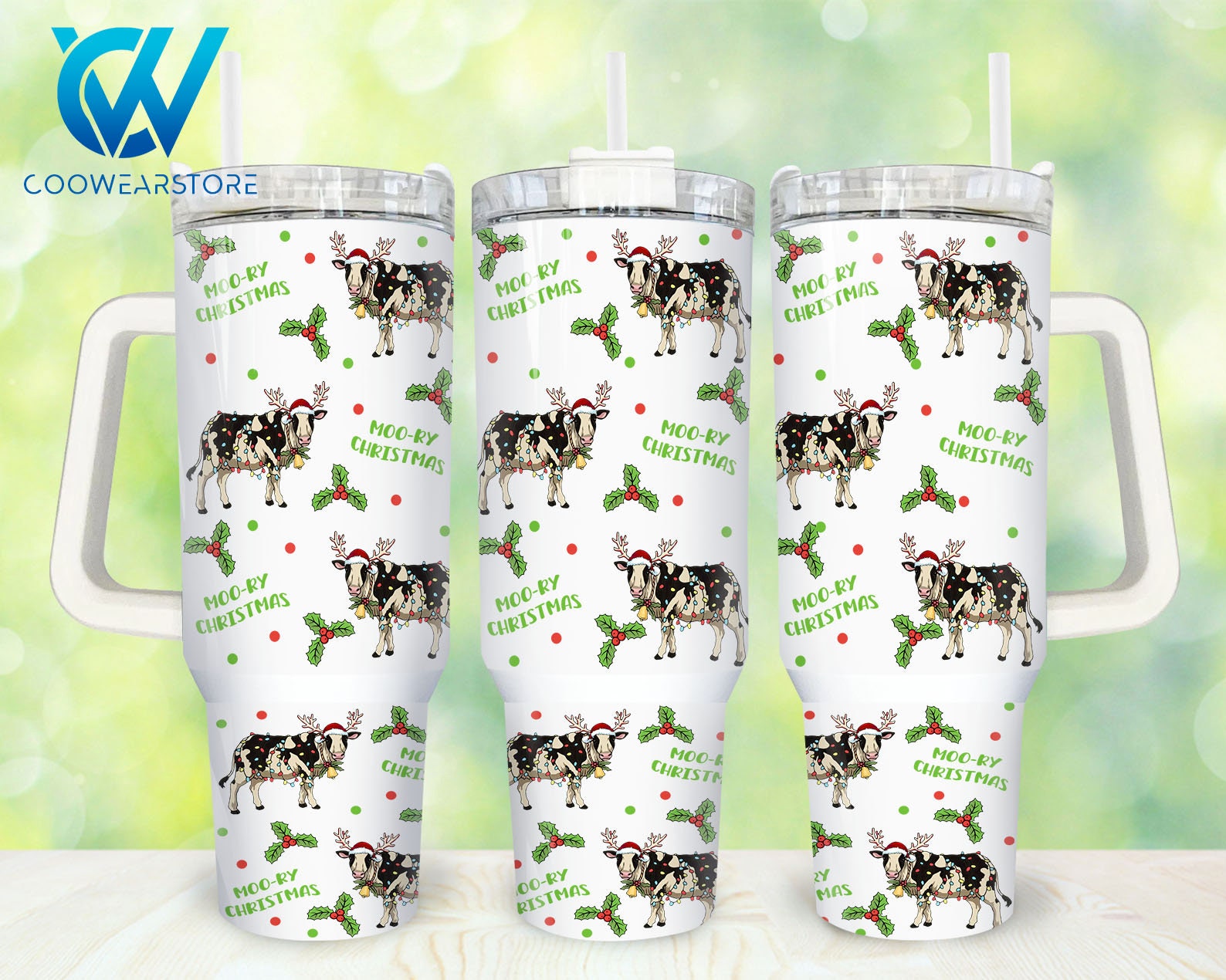 Celebrate the season with this charming cow-themed Christmas tumbler. Perfect for hot or cold drinks on the go, featuring a sturdy handle and festive design.