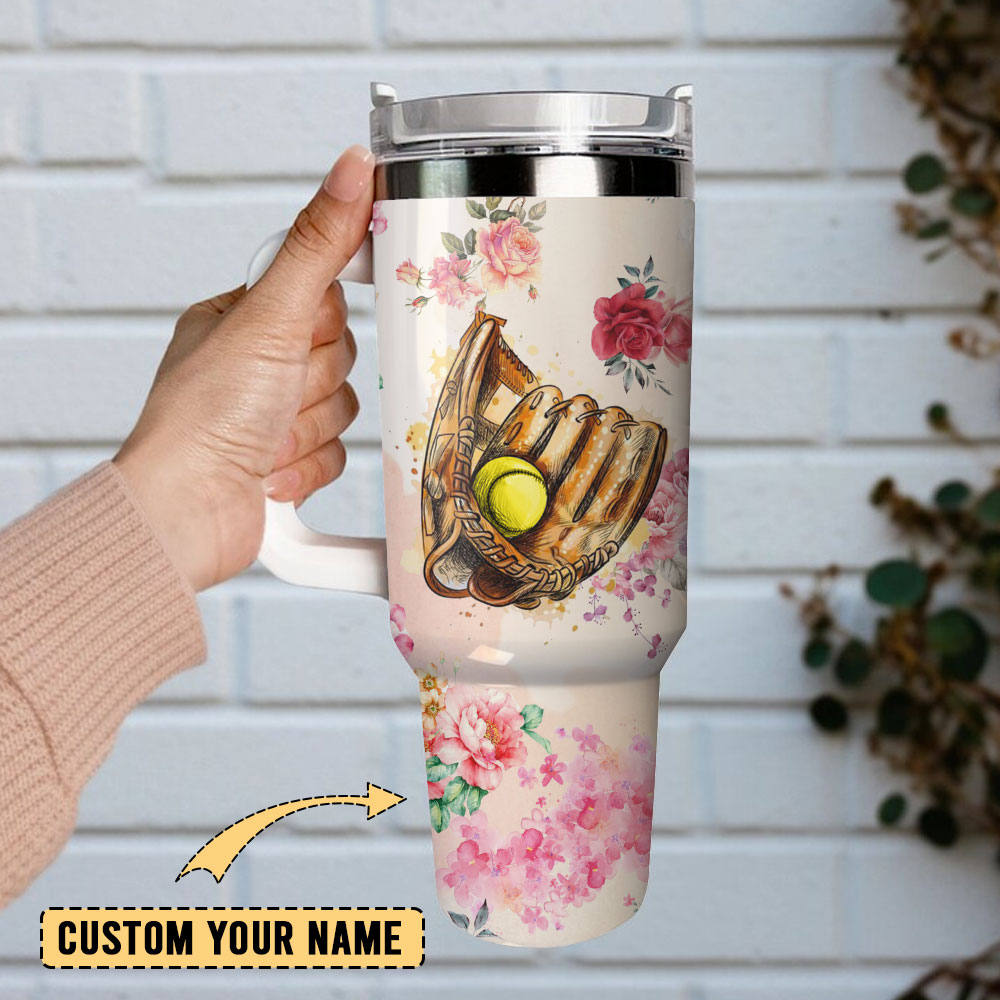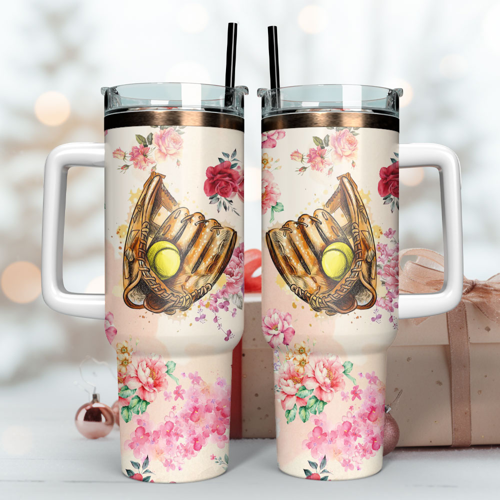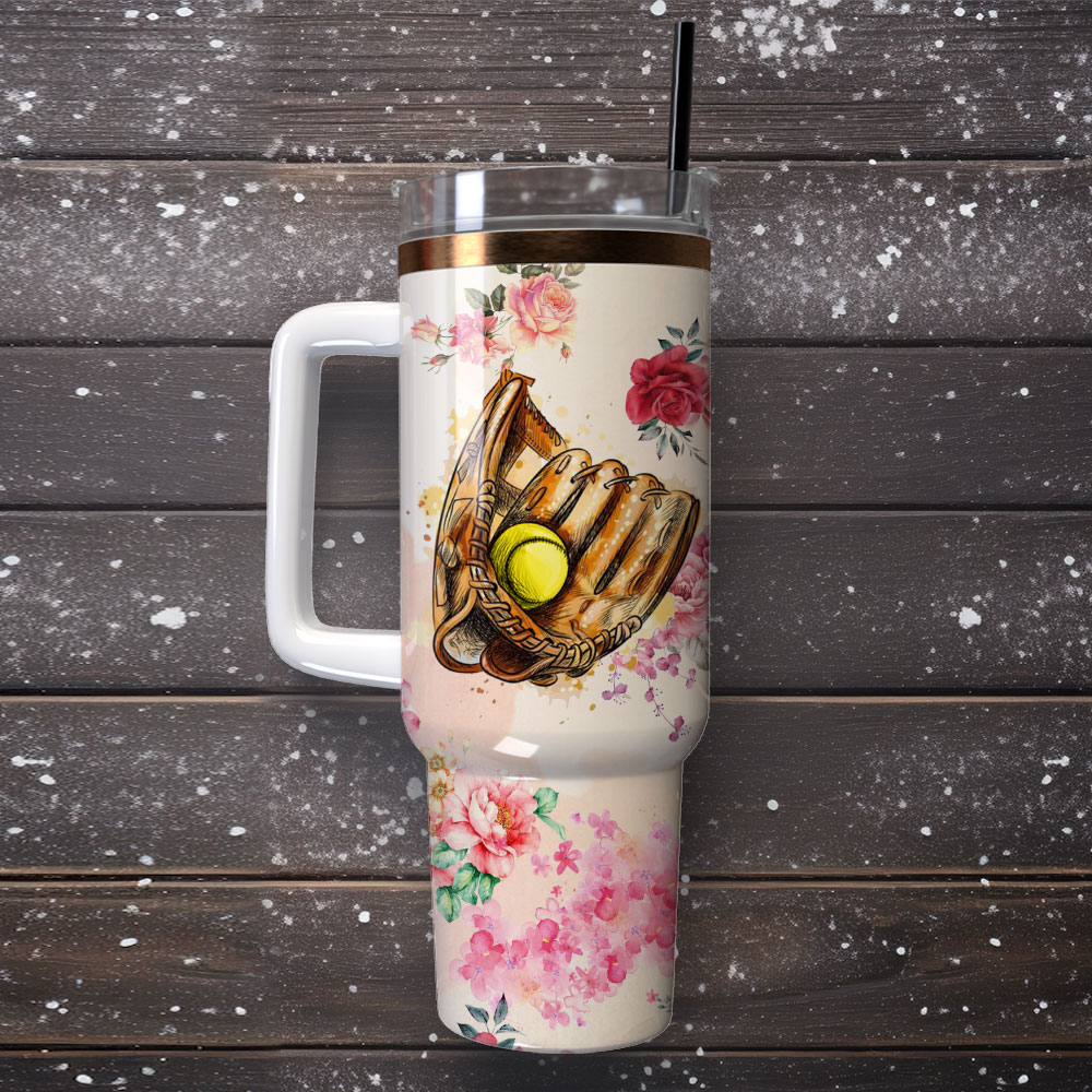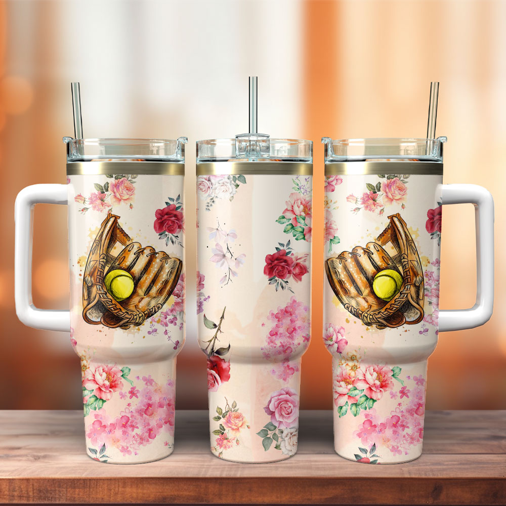Stay refreshed on the go with this stylish floral tumbler featuring a baseball and softball design. Perfect for sports lovers, it keeps drinks hot or cold for hours.