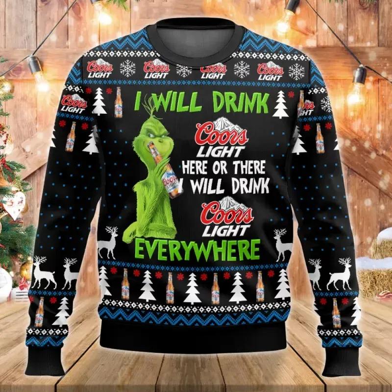 Grinch I Will Drink Coors Light Everywhere Ugly Christmas Sweater, Grinch Holiday Sweater