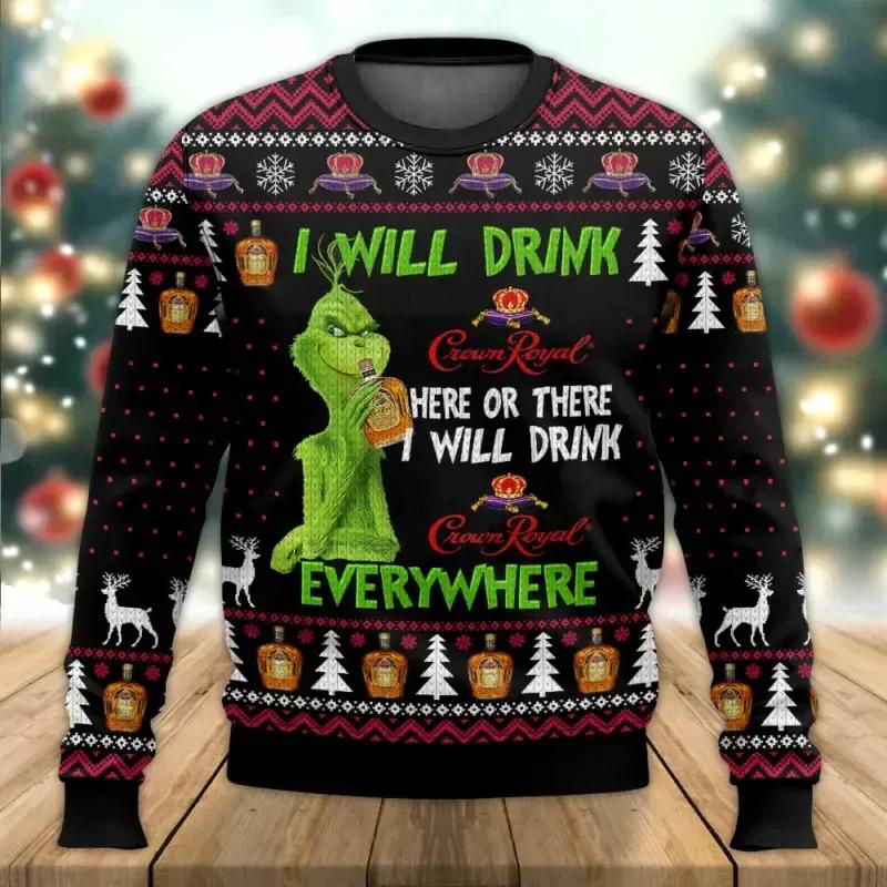 Grinch I Will Drink Crown Royal Everywhere Ugly Christmas Sweater, Grinch Holiday Sweater