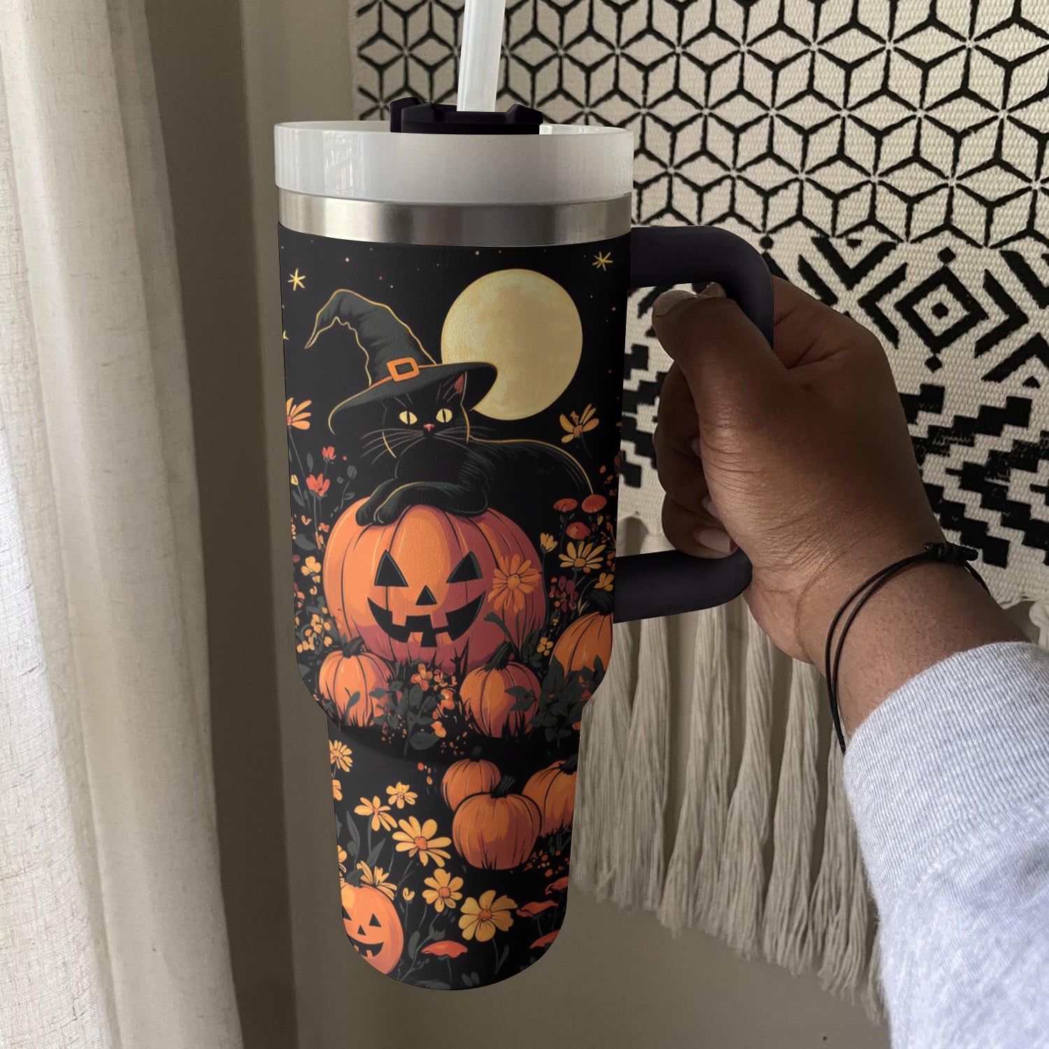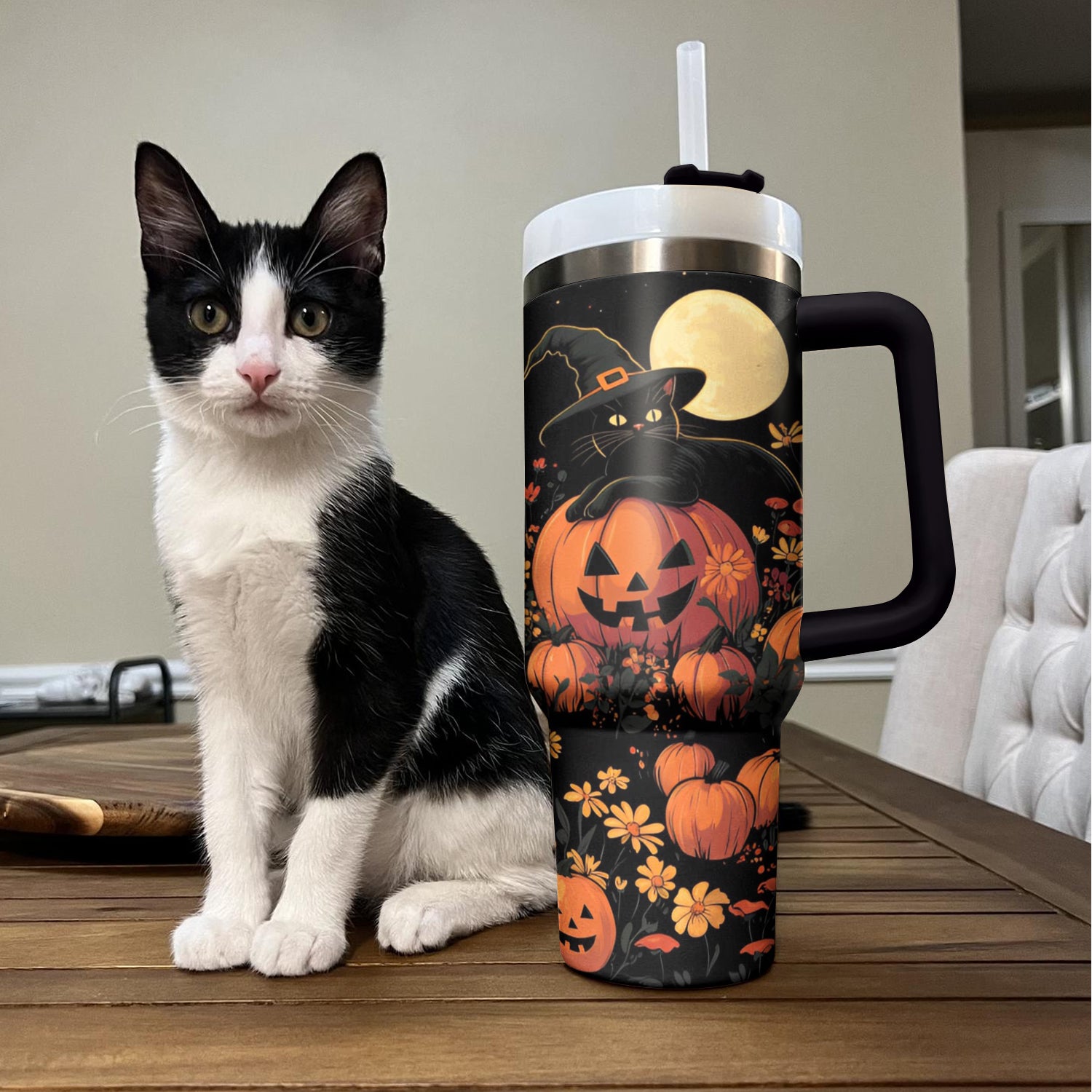 Elevate your Halloween festivities with this enchanting tumbler featuring a black cat and pumpkin design. Perfect for keeping your drinks stylishly spooky!