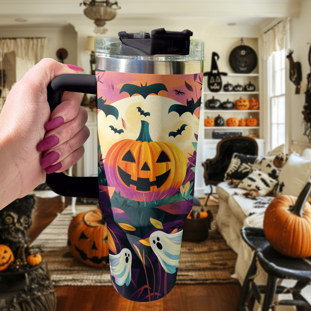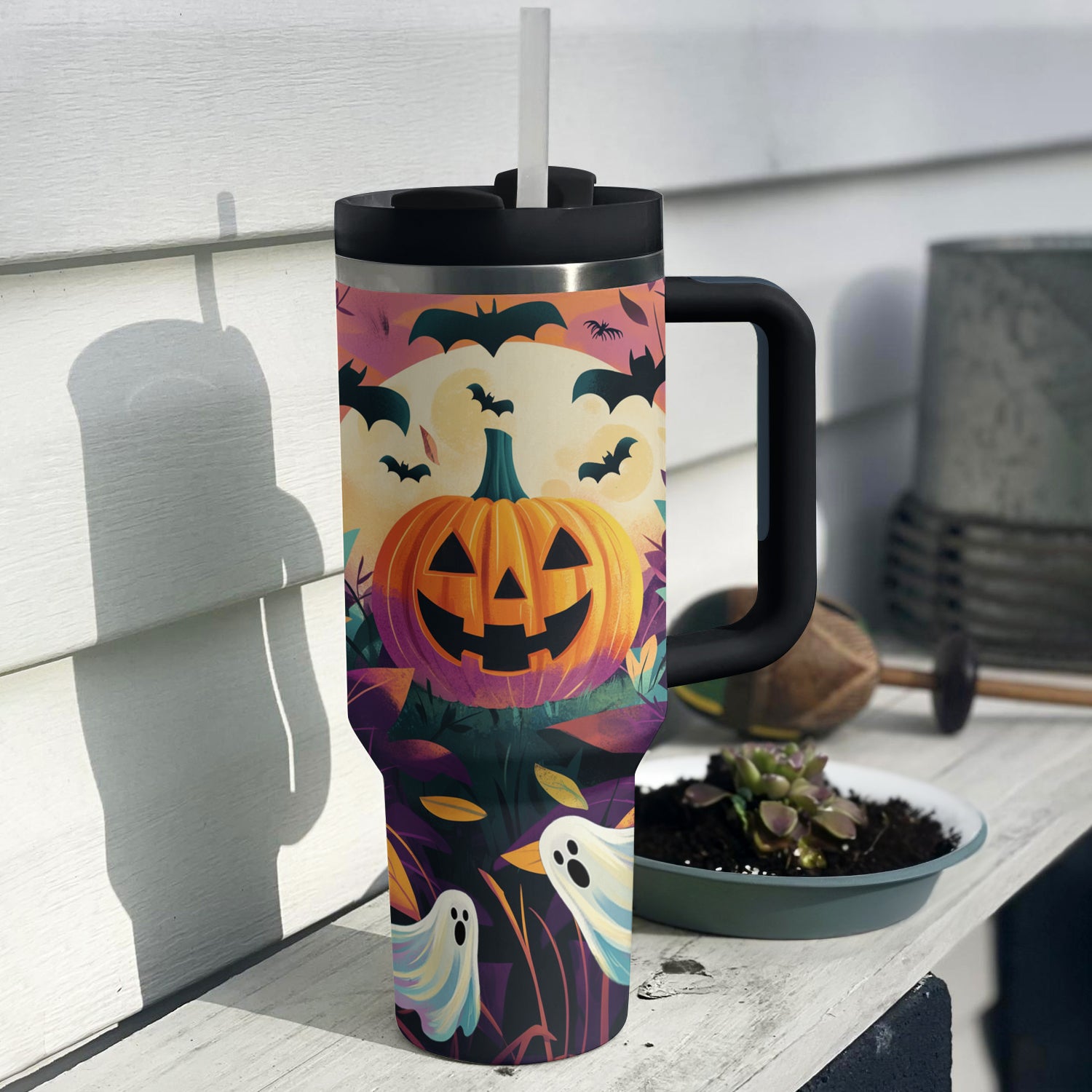 Celebrate Halloween with this festive tumbler featuring a pumpkin and ghost design. Perfect for keeping your drinks warm or cold on the go!