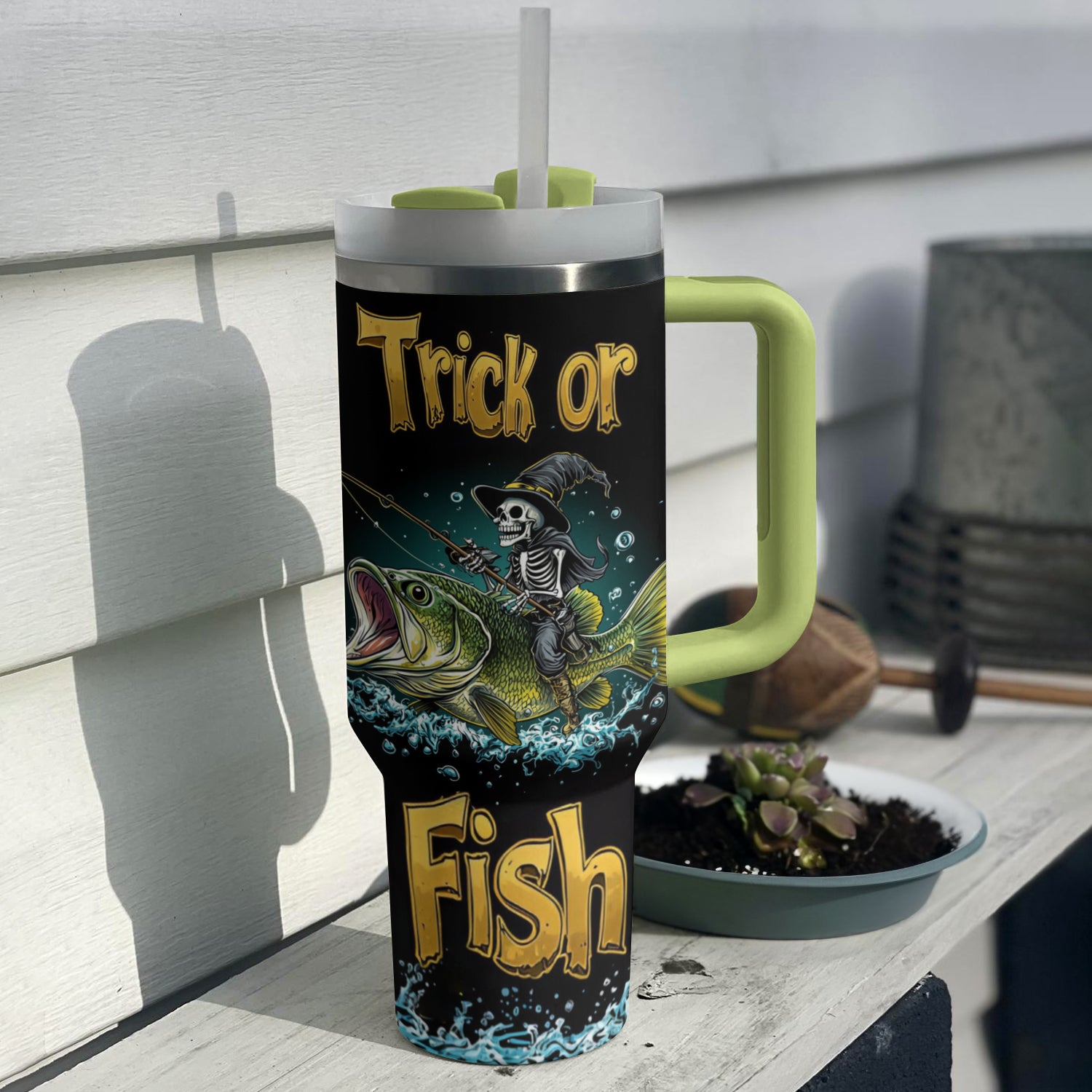 Celebrate Halloween with this unique ‘Trick or Fish’ tumbler. Perfect for keeping drinks hot or cold, featuring a fun skeleton fishing design.