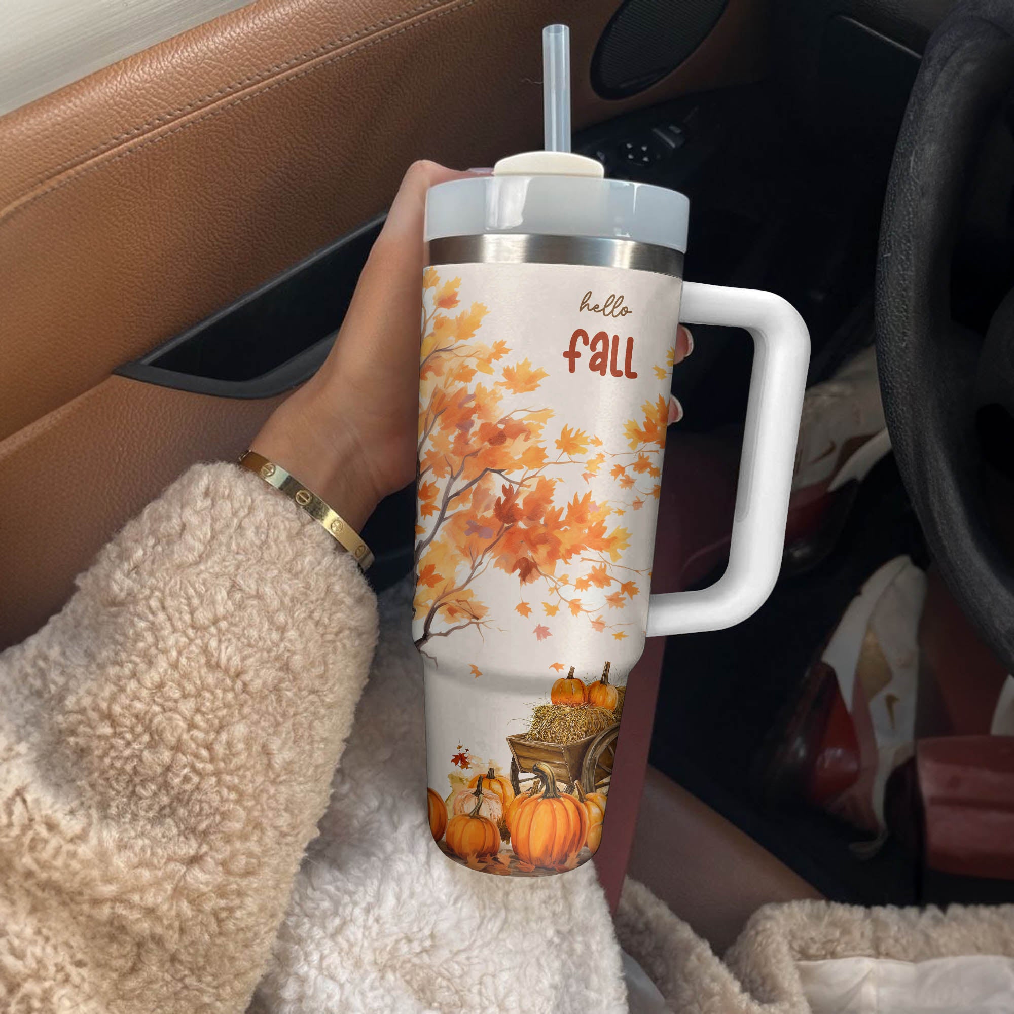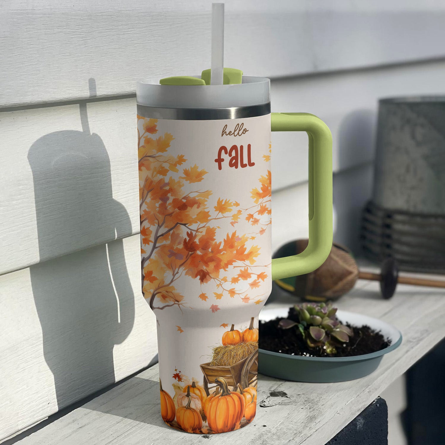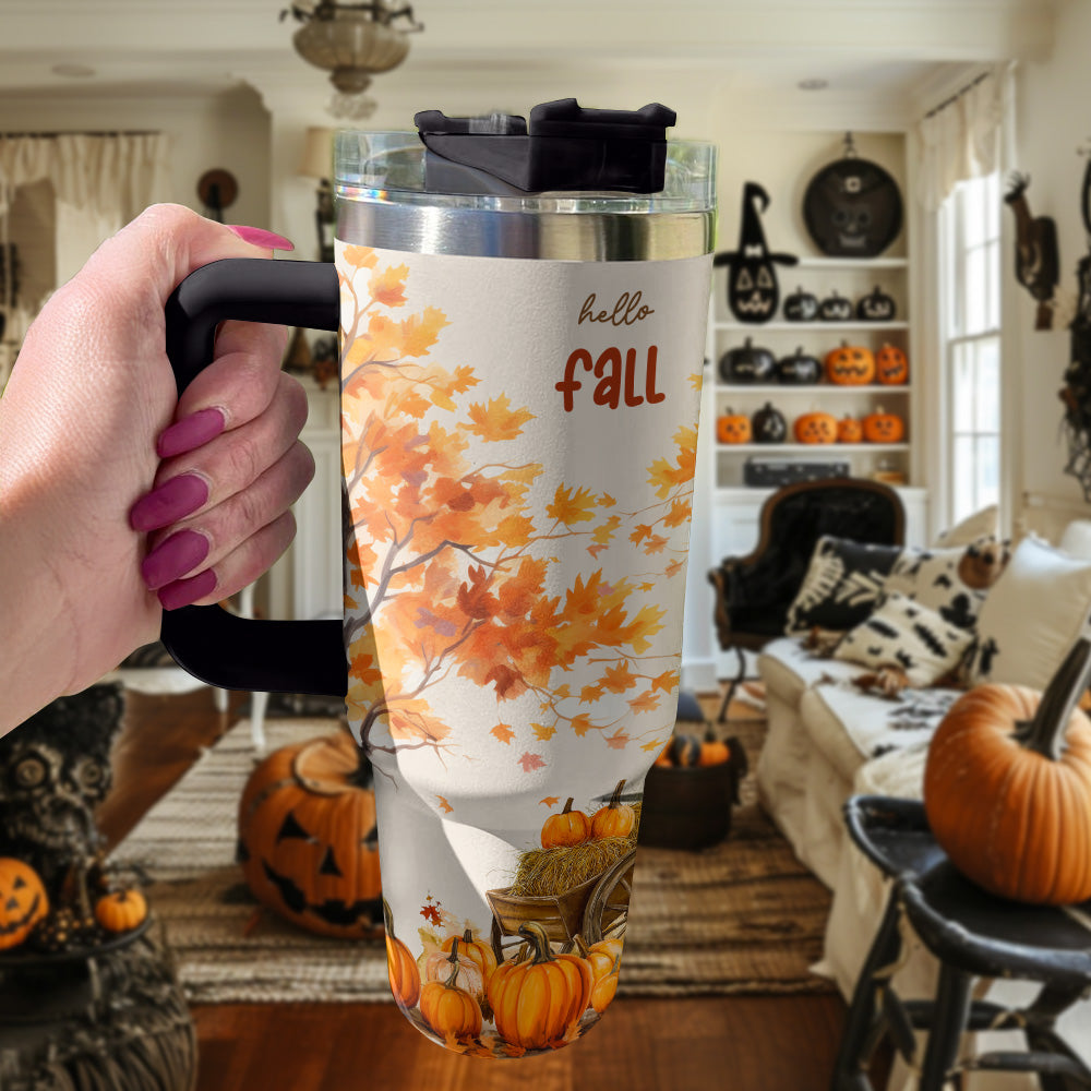 Embrace the season with this fall-themed tumbler. Perfect for keeping your drinks hot or cold, featuring a sturdy handle and straw for easy sipping.