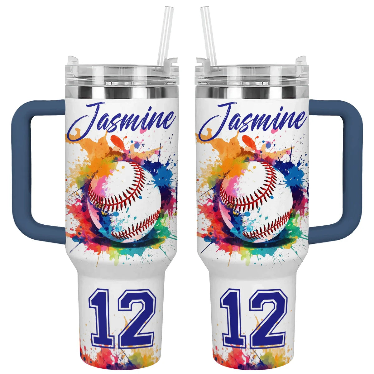 Stay hydrated in style with this personalized baseball tumbler. Features a vibrant splash art design and a sturdy handle for easy carrying.