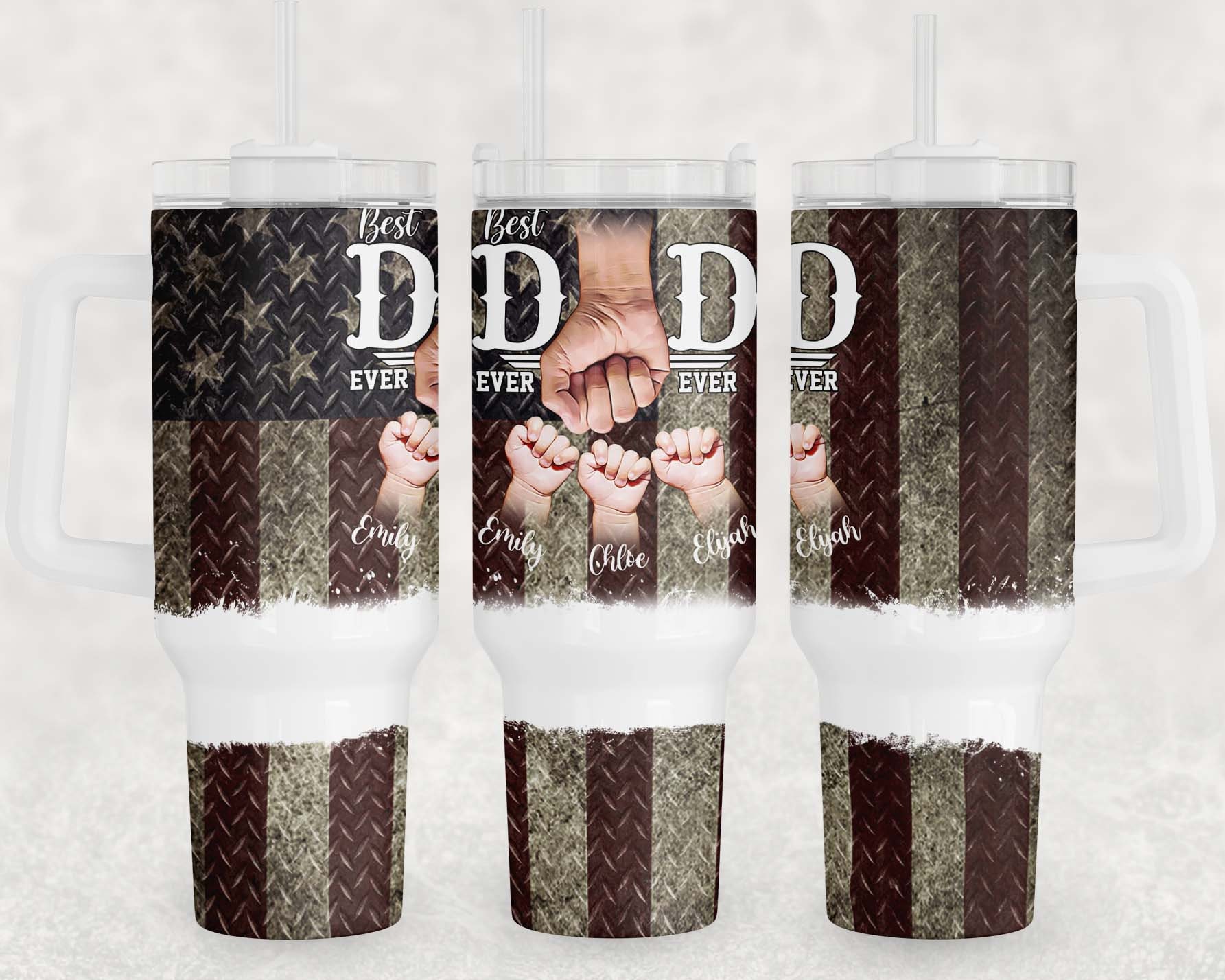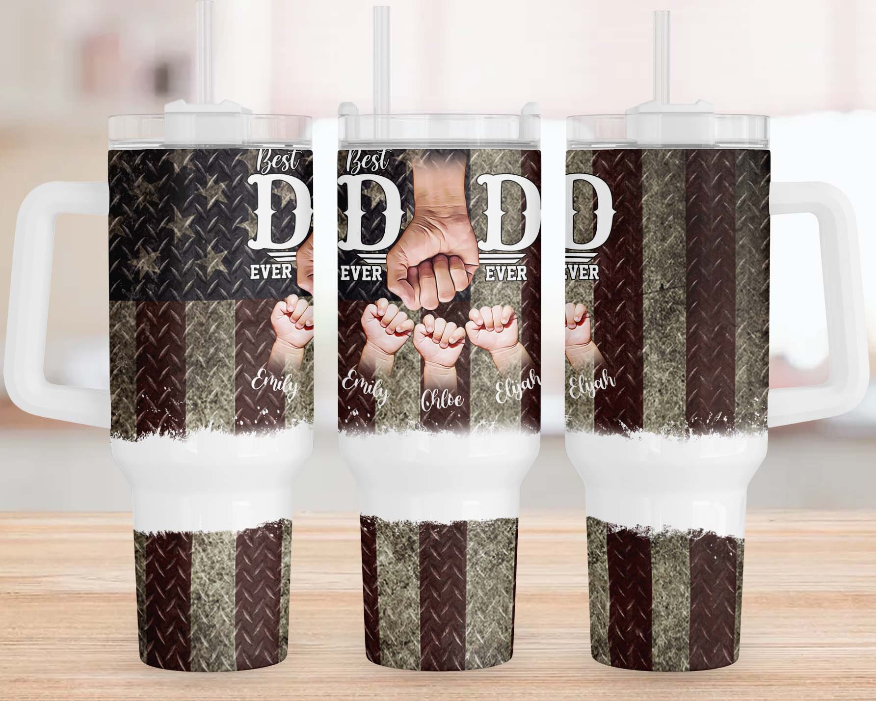 Celebrate dad with this custom tumbler featuring ‘Best Dad Ever’ design and personalized names. Ideal gift for Father’s Day or any occasion.