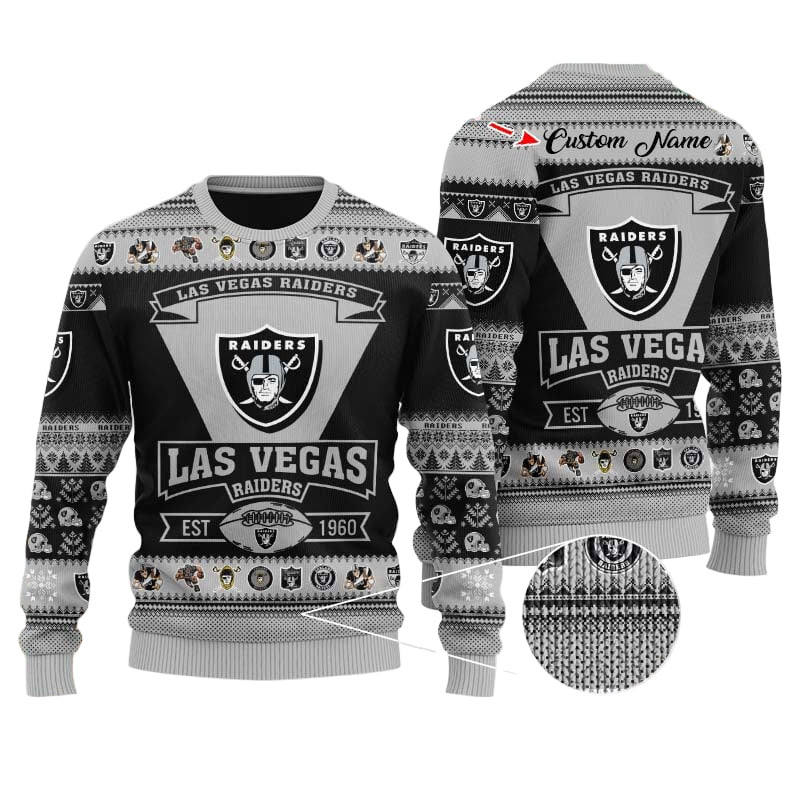 Personalized Ugly Christmas Sweater Las-Vegas, Raider Nation Grey/Black Custom Name Gift For Football Fan Ugly Xmas Jumper