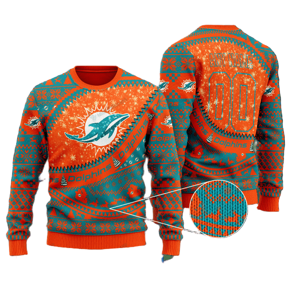 Personalized Ugly Christmas Sweater Miamidolphins, Go Fins Green/Orange Custom Name And Number Gift For Football Fan Ugly Xmas Jumper