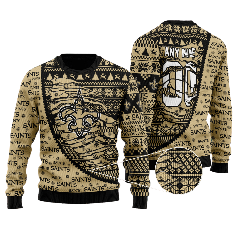 Personalized Ugly Christmas Sweater New-Orleans-Saints, Go Saints! Black/Beige Custom Name And Number Gift For Football Fan Ugly Xmas Jumper