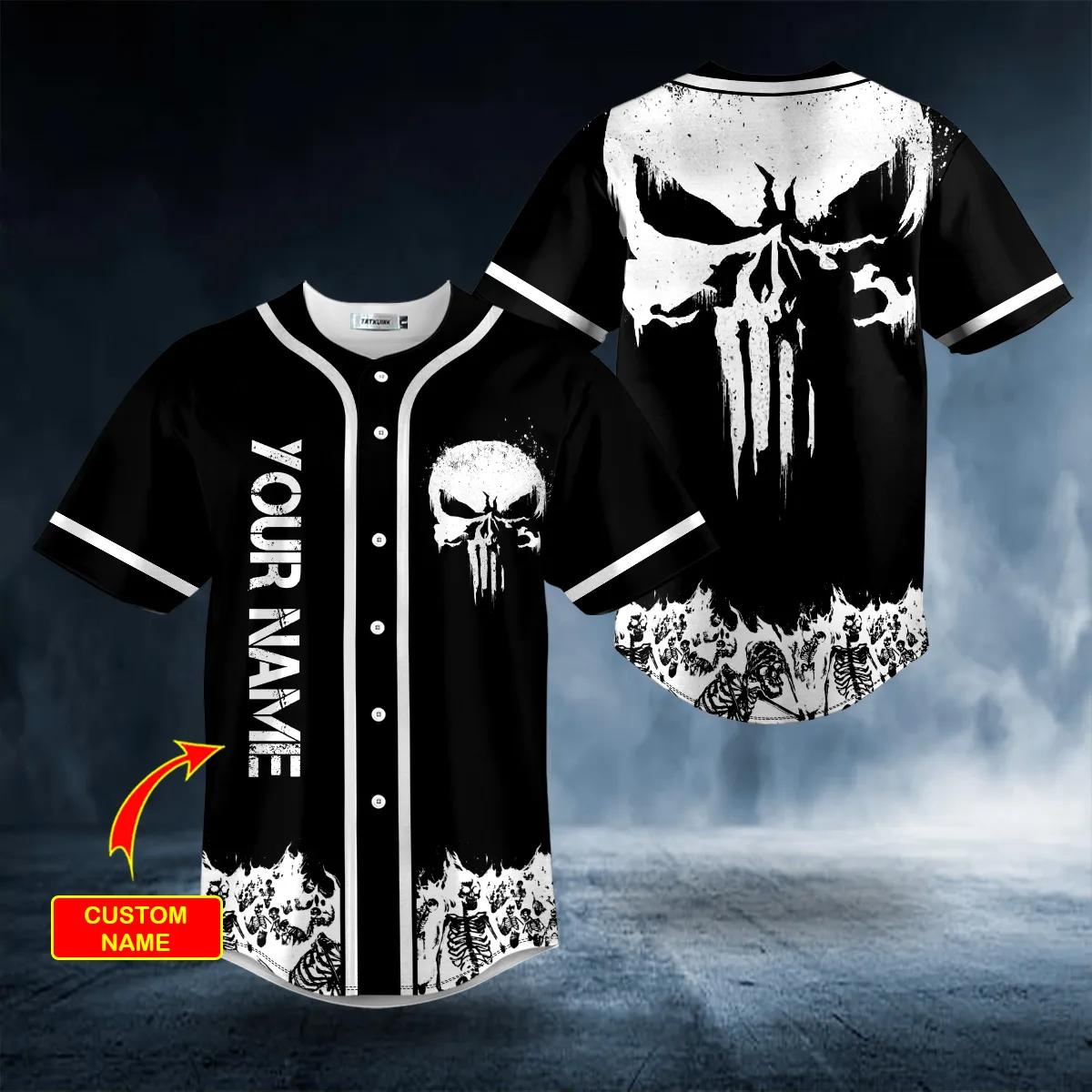 Looking for something unique and stylish? Check out our Punisher Skull Symbol Distressed Custom Baseball Jersey! This one-of-a-kind jersey is perfect for those who want to make a statement.Introducing our Skull Custom Baseball Jersey Collection! These Baseball Jerseys are made with high-quality materials and feature intricate details that are sure to turn heads. Whether you’re looking for a Baseball Jersey to support your favorite team or you want to show off your own personal style, our collection has something for everyone.So what are you waiting for? Check out our Skull Custom Baseball Jersey Collection today!Features:Best material:?Our baseball jersey shirt is made of premium polyester + spandex.Customization:?We make baseball shirt on demand, so give us sports-inspired logo you across the front like to create your one-of-a-kind cap.Gift of Love:?A perfect idea if you are finding a birthday gift, a festival gift, Father?s Day, Valentine?s Day Christmas gift for your family member, friend, coworker, roommates. A wonderful way to honor the memory of a special person or milestone.Garment Care: Machine wash or hand wash. Tumble dry on low heat. Avoid direct heat. Do not use bleach.Make your sporty outfit more unique and fashionable with AOP Baseball Jersey Tatkuink now! We got all of what your customers expect with our custom baseball jerseys.Customer Support:If you need any assistance, you can contact us directly on the website via Chatbox, or send us a notice via email to: [email protected]