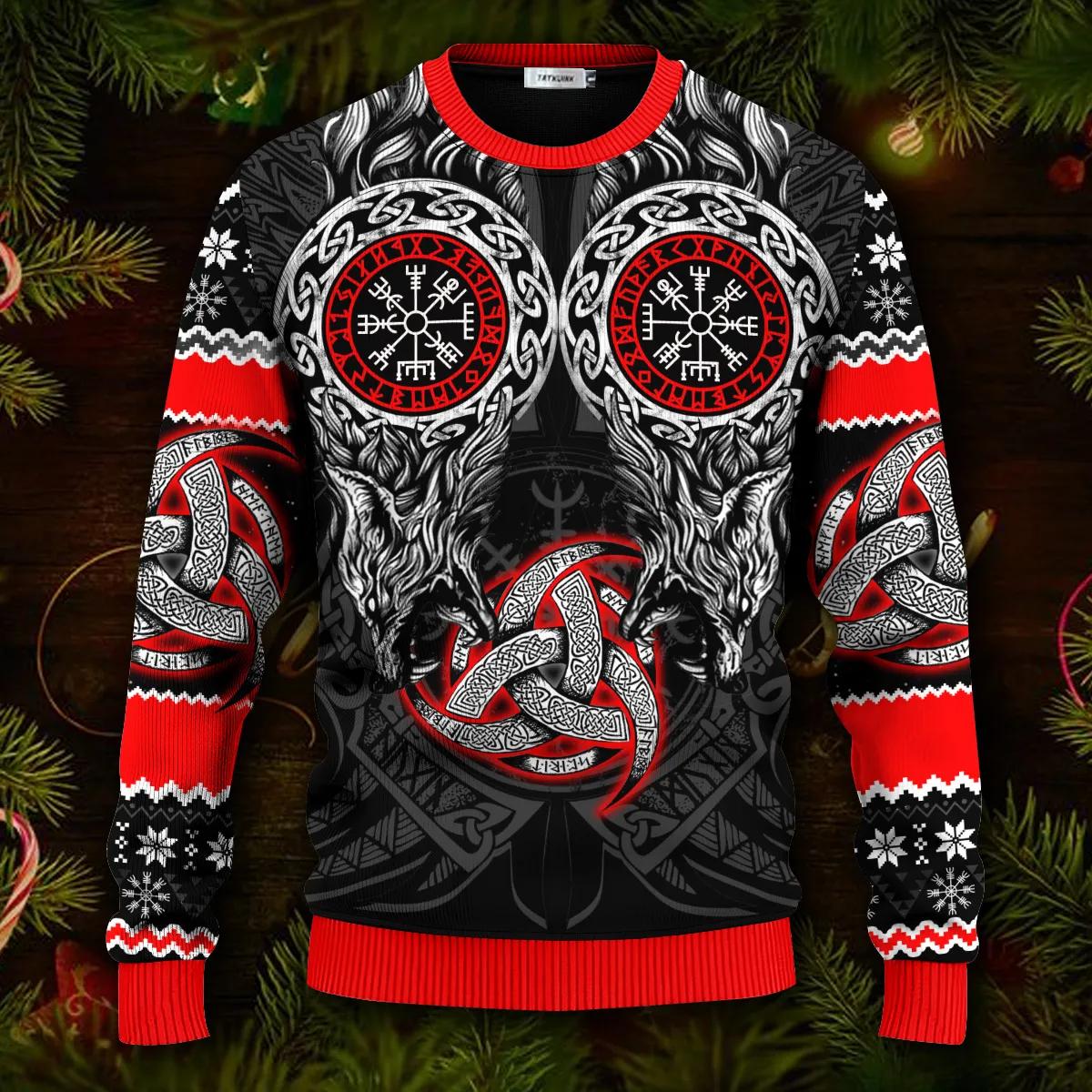 Red Triple Horn Pattern Wolf Viking Ugly Christmas Sweater