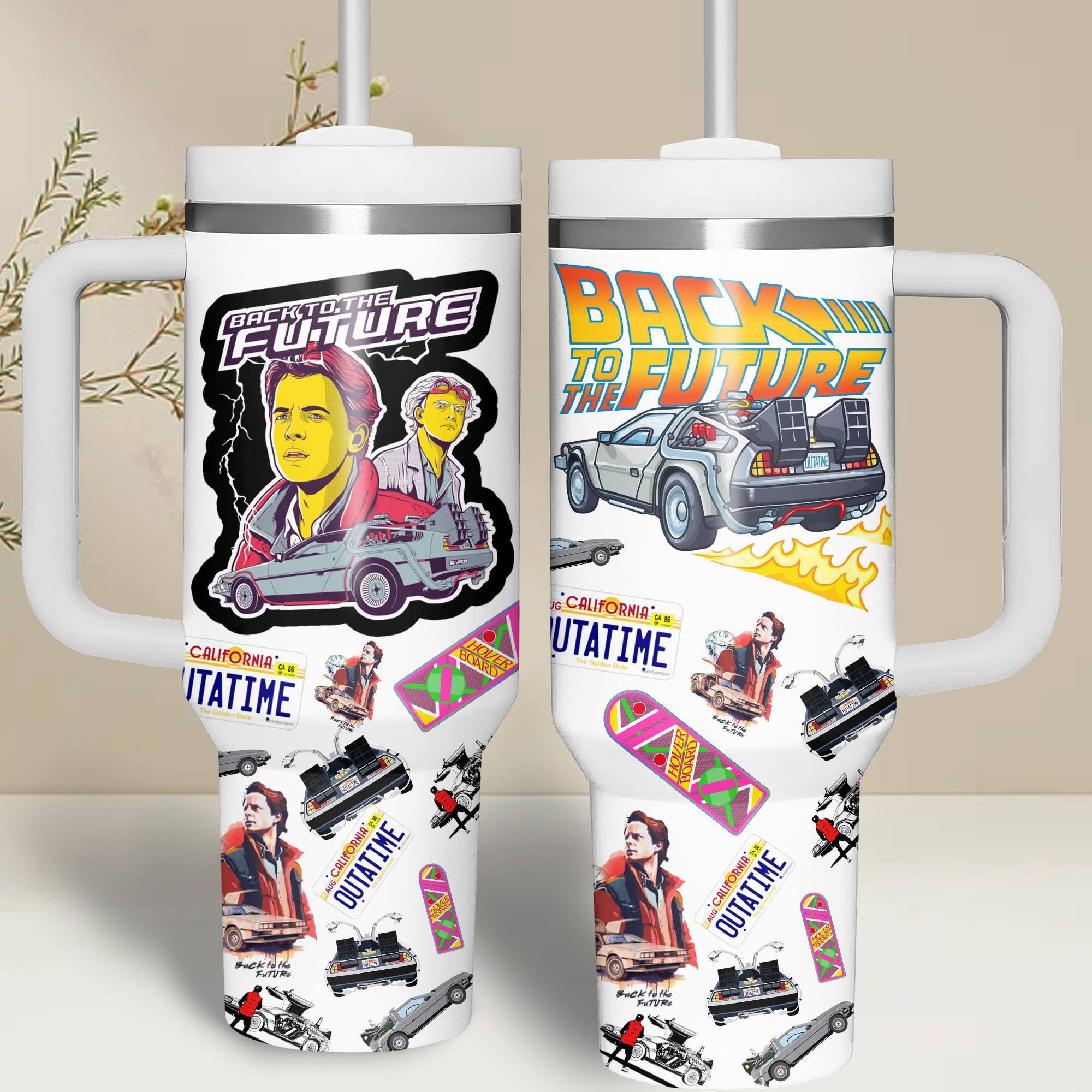 Embrace nostalgia with this vibrant travel mug featuring classic time-travel motifs. Perfect for fans and on-the-go adventures.