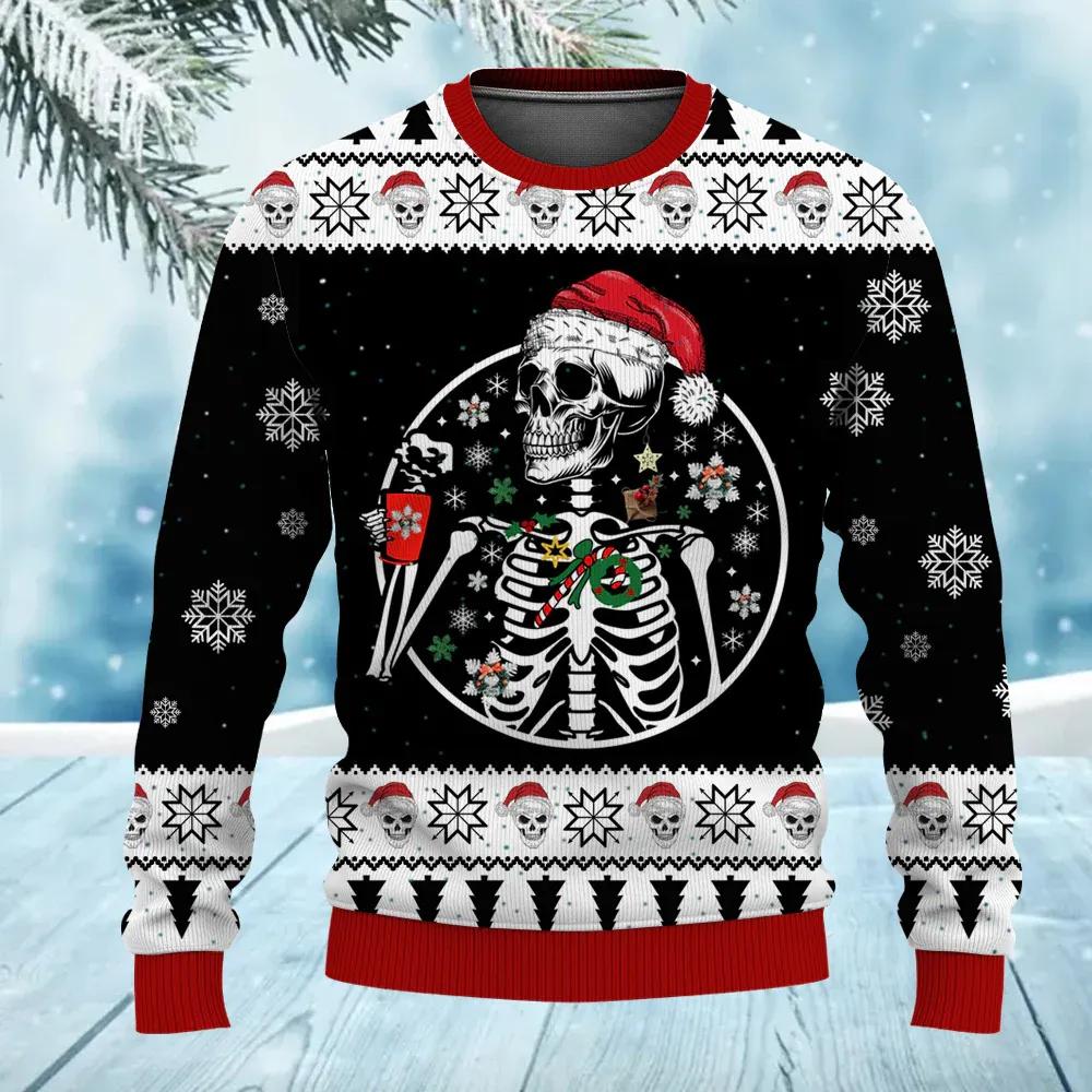 Skeleton Drinking Coffee Skull Funny Ugly Christmas Sweater Men & Women, Skull Xmas Sweater – Gowgowstore.com