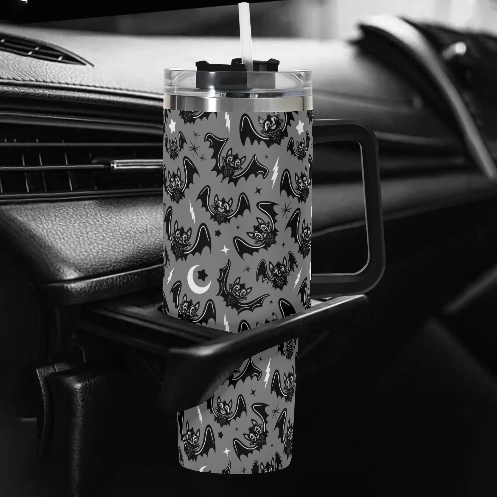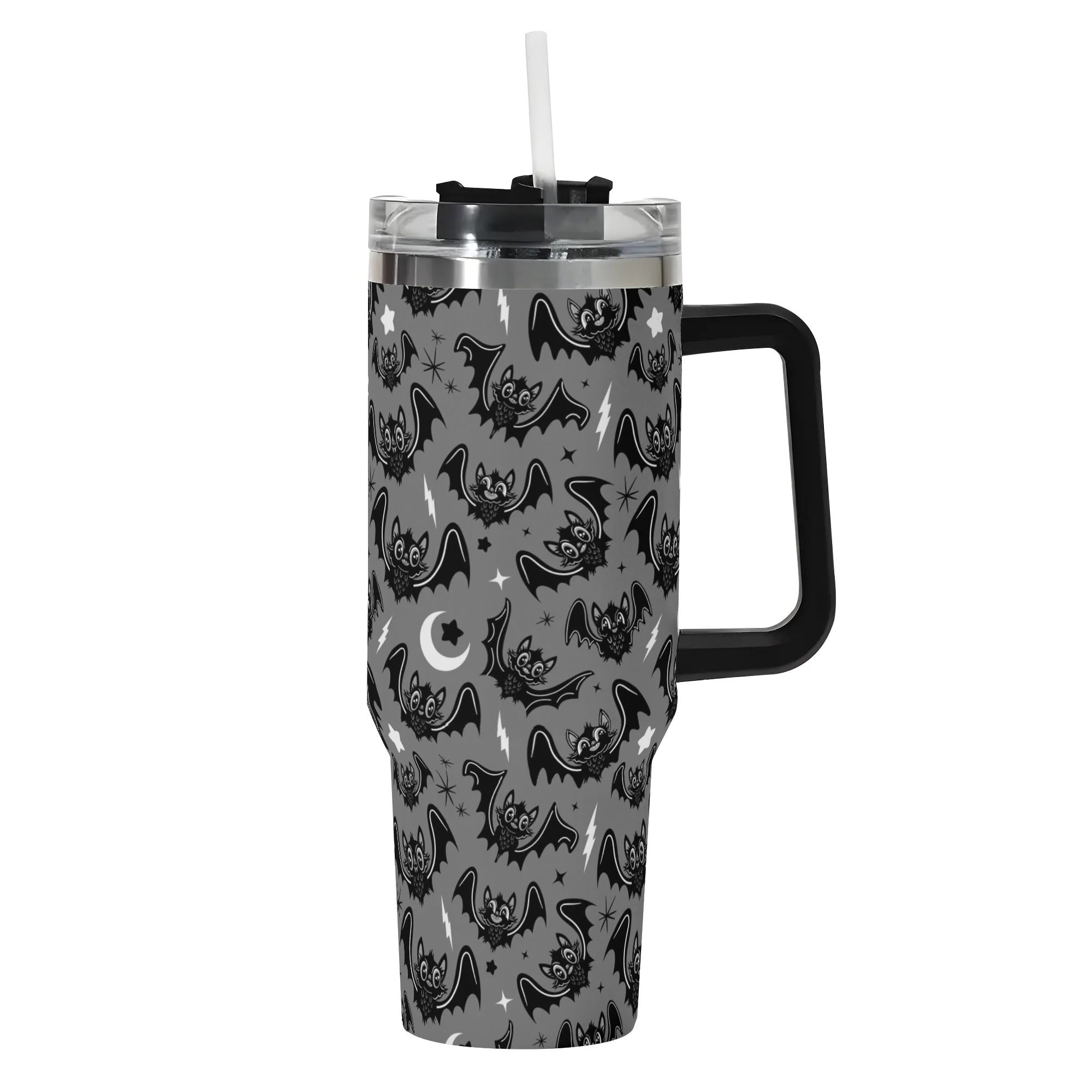 Stay refreshed on the go with this spooky bat pattern travel mug. Perfect for hot or cold drinks, featuring a secure lid and comfortable handle.