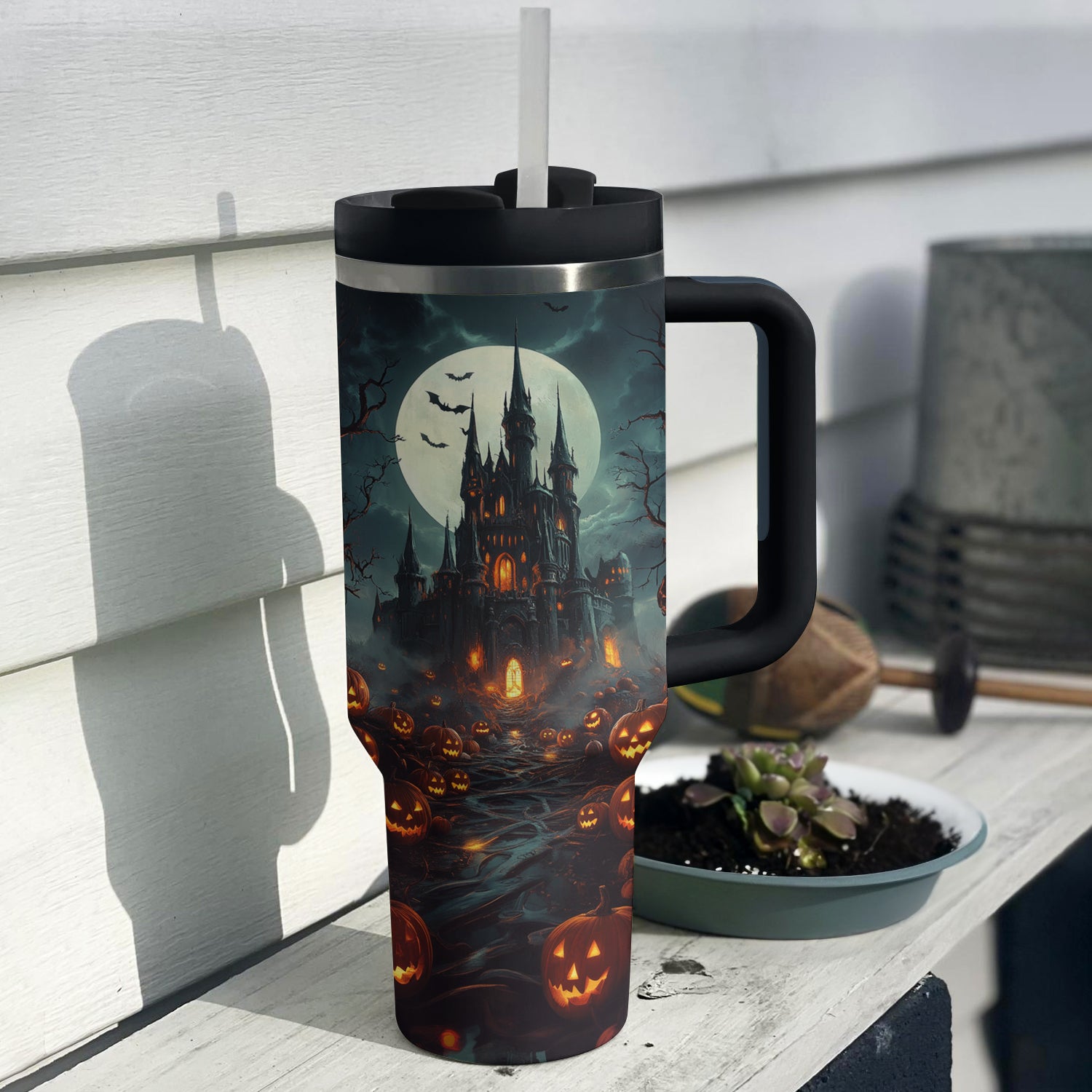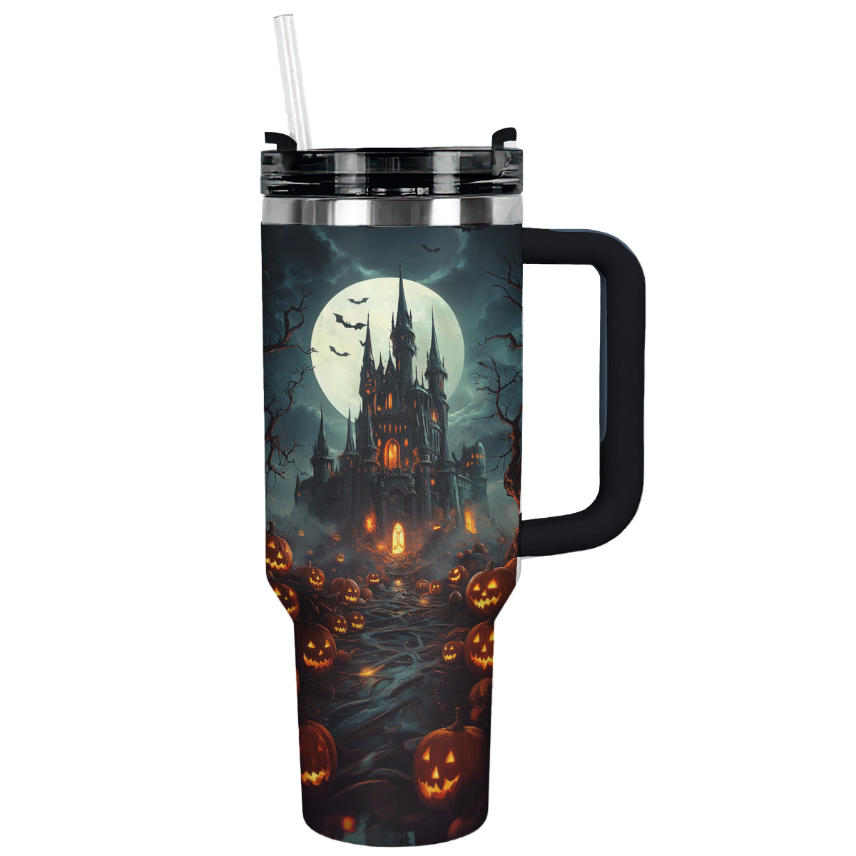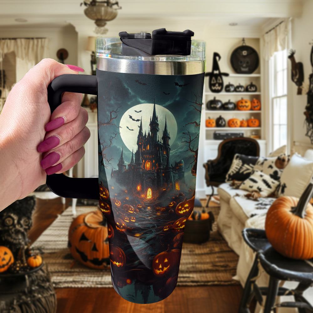 Sip in style with this spooky castle-themed tumbler. Perfect for Halloween lovers, this 40oz insulated mug keeps drinks hot or cold on the go.