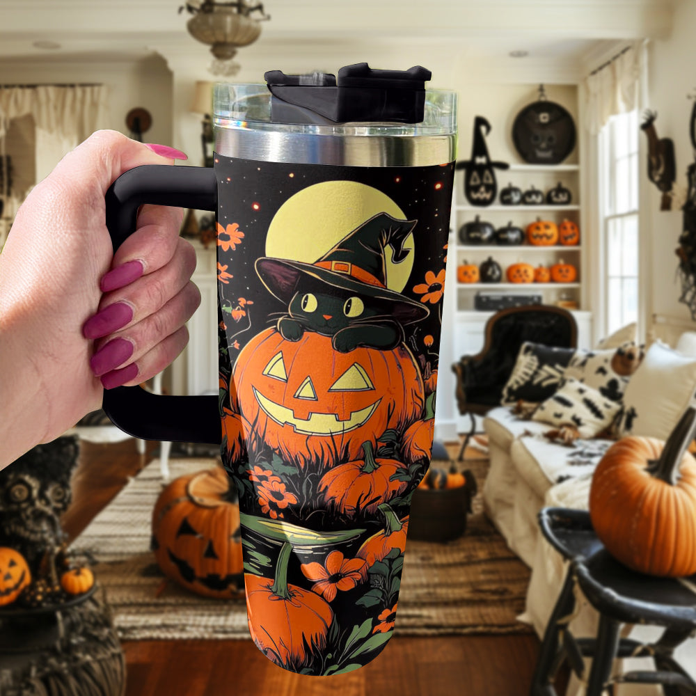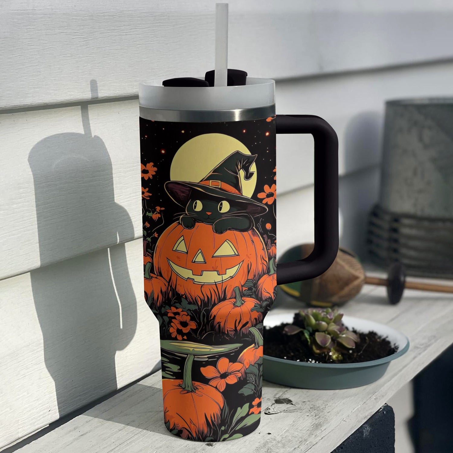 Embrace the Halloween spirit with this whimsical tumbler featuring a charming black cat and pumpkin design. Ideal for sipping your favorite fall beverages.