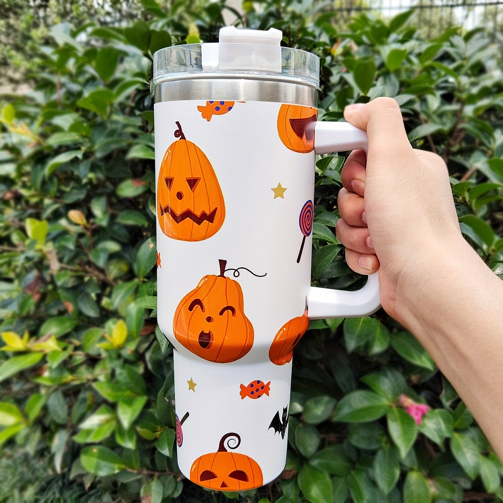 Celebrate the spooky season with this vibrant Halloween-themed tumbler. Perfect for keeping your drinks hot or cold during fall festivities.