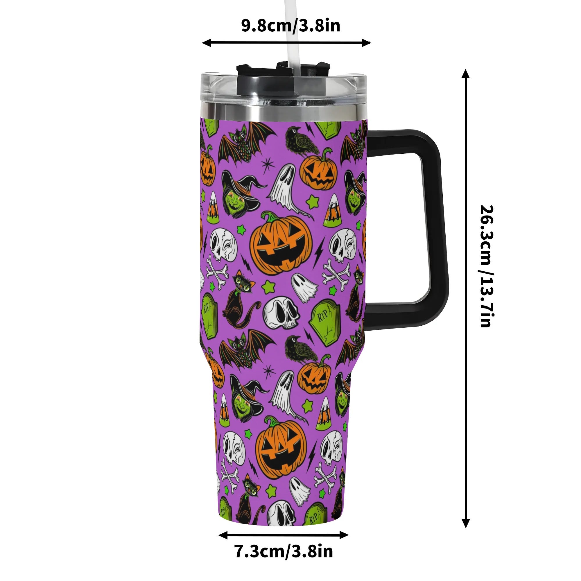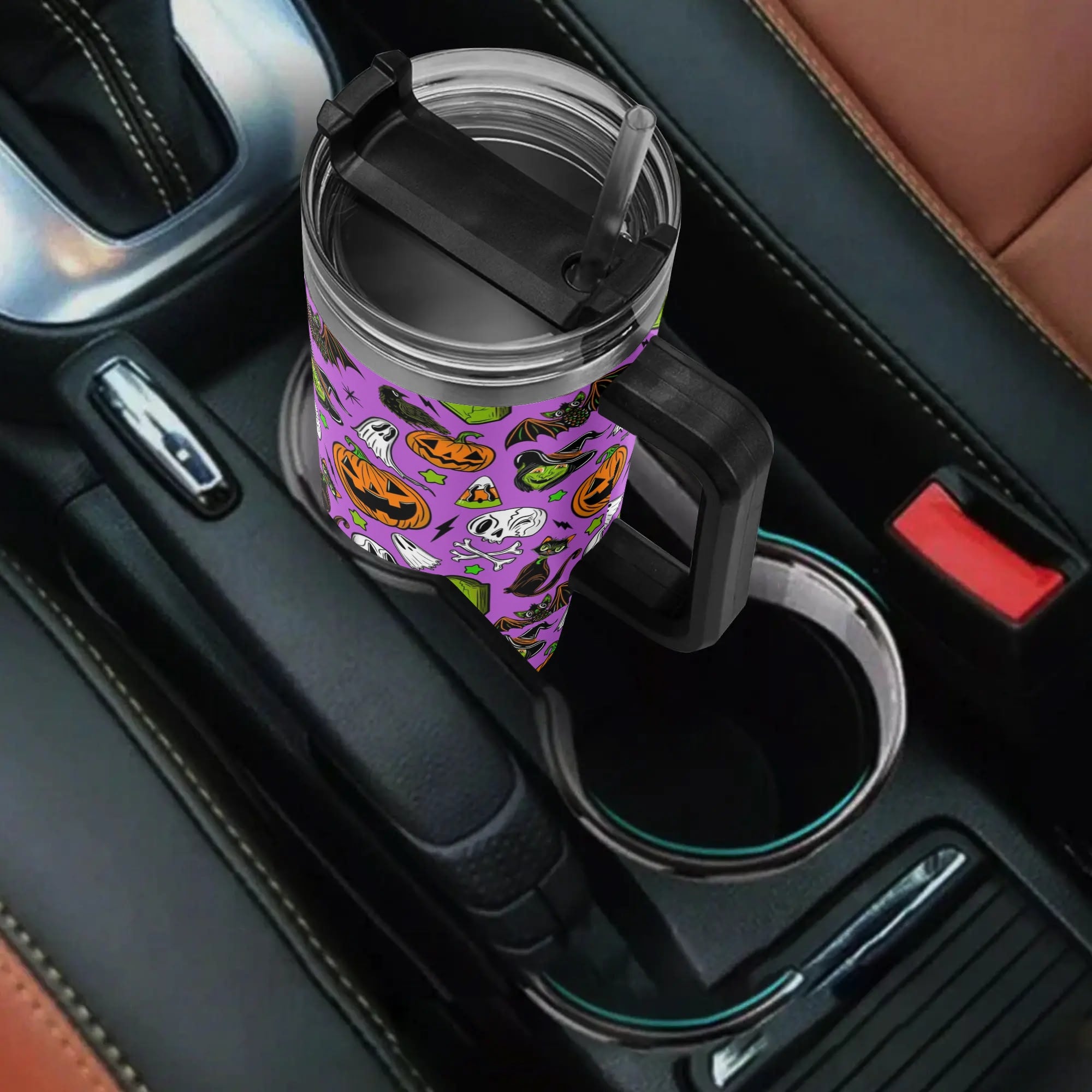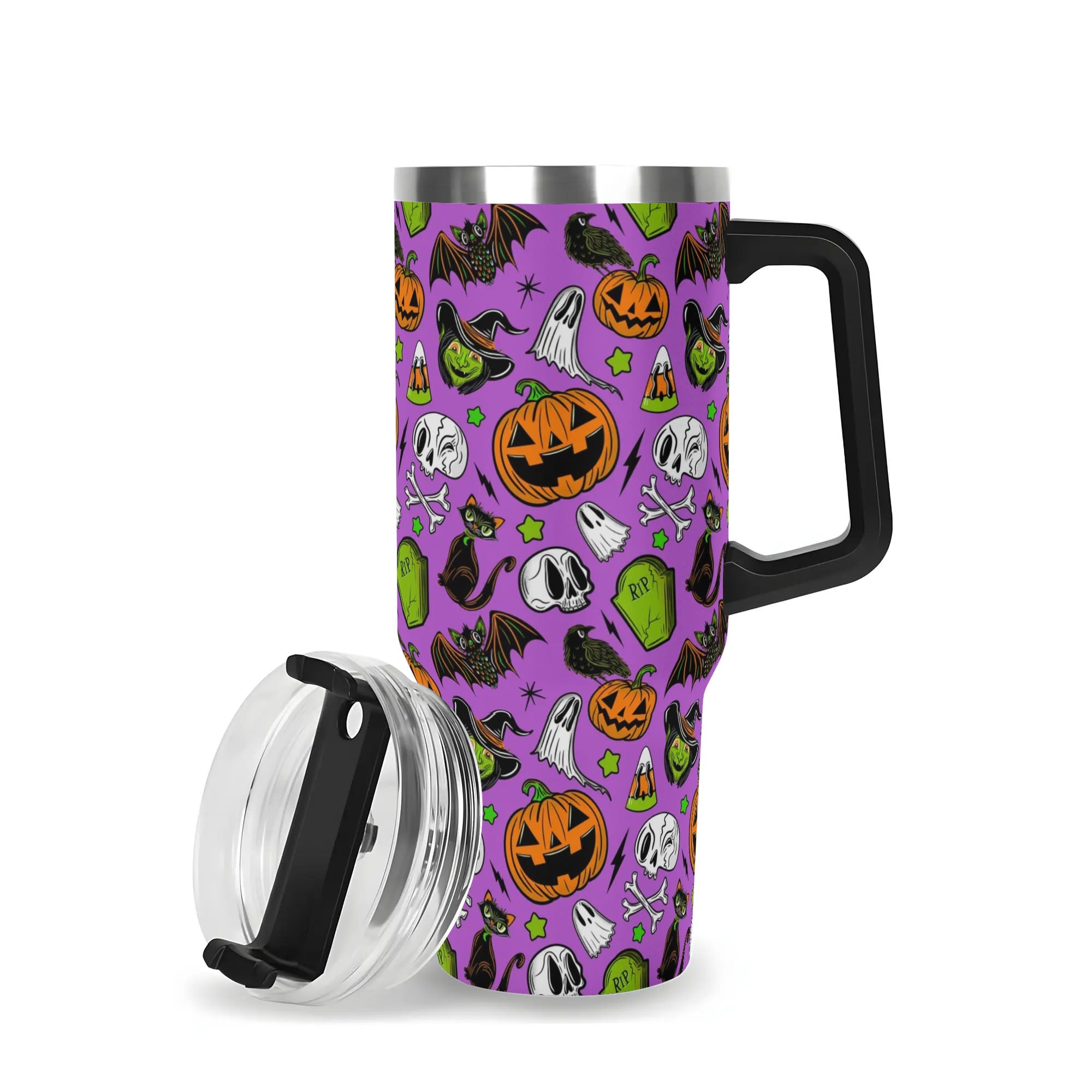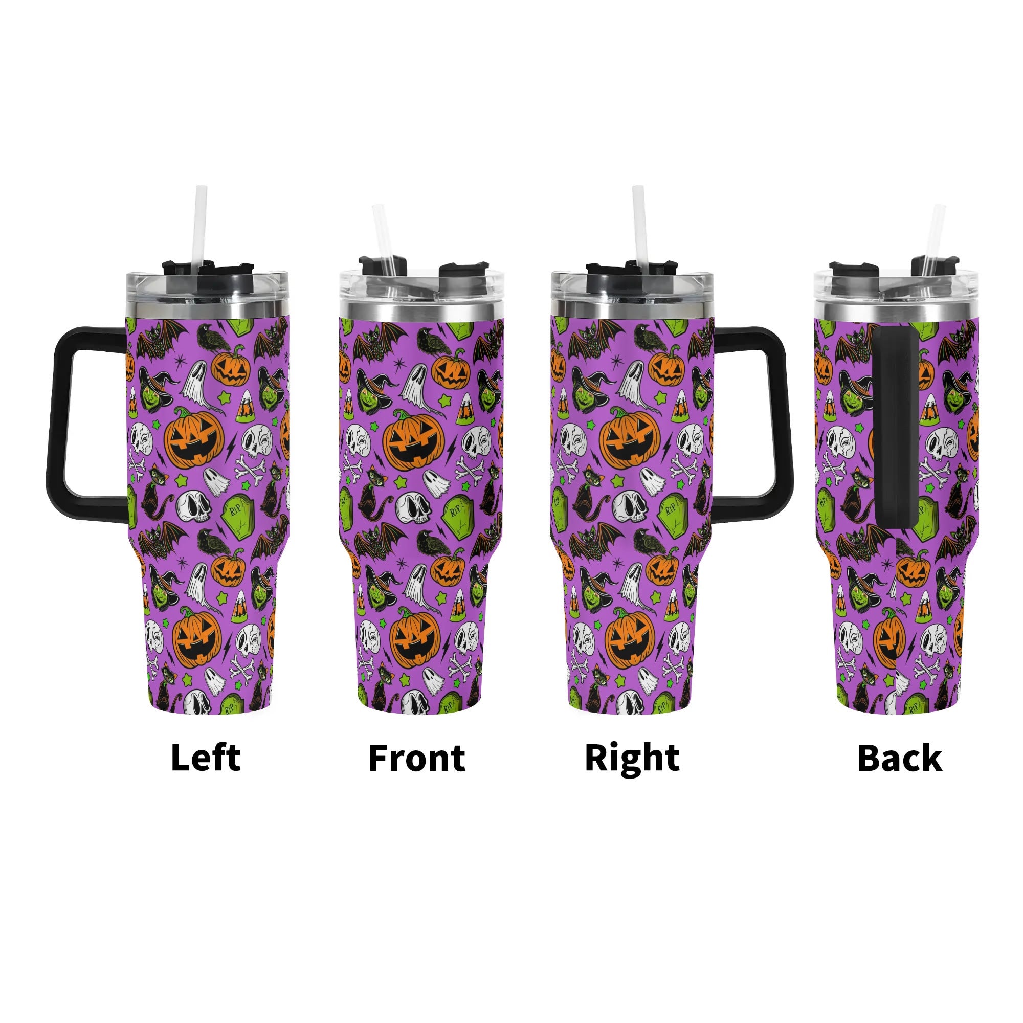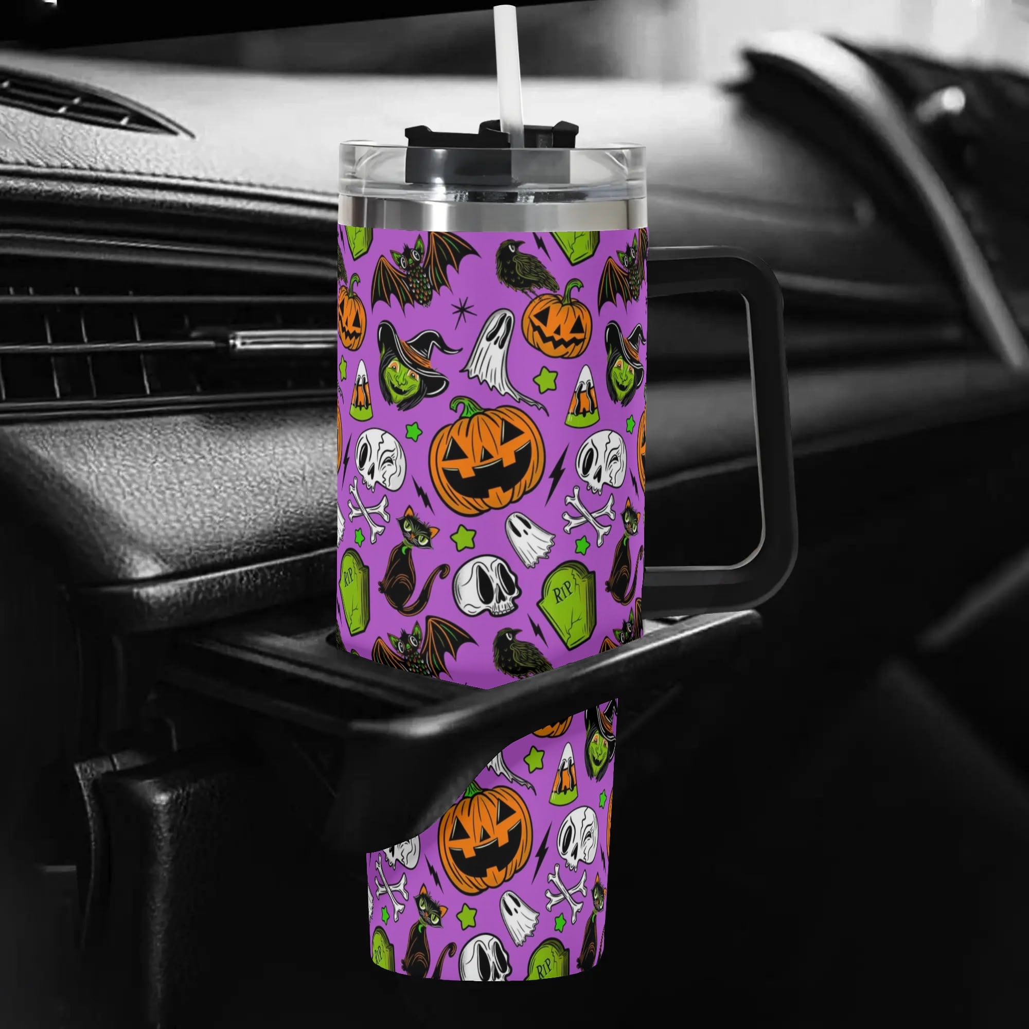 Celebrate the spooky season with this vibrant Halloween-themed tumbler. Keeps your drinks cool or warm, featuring a convenient handle and straw.