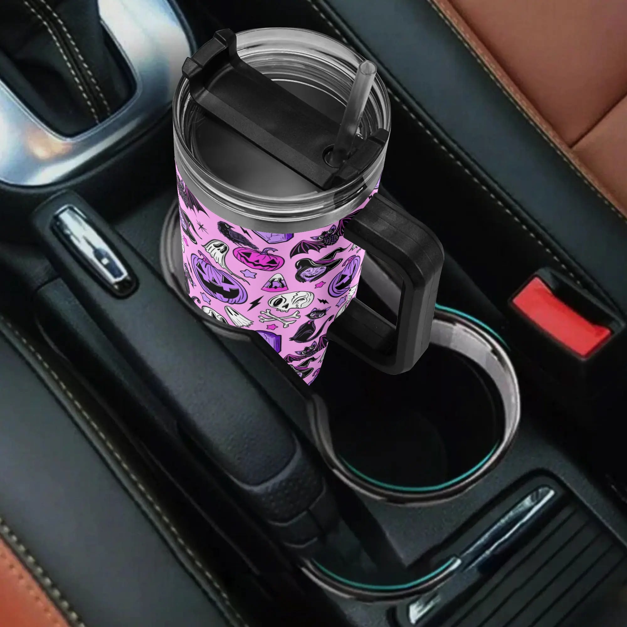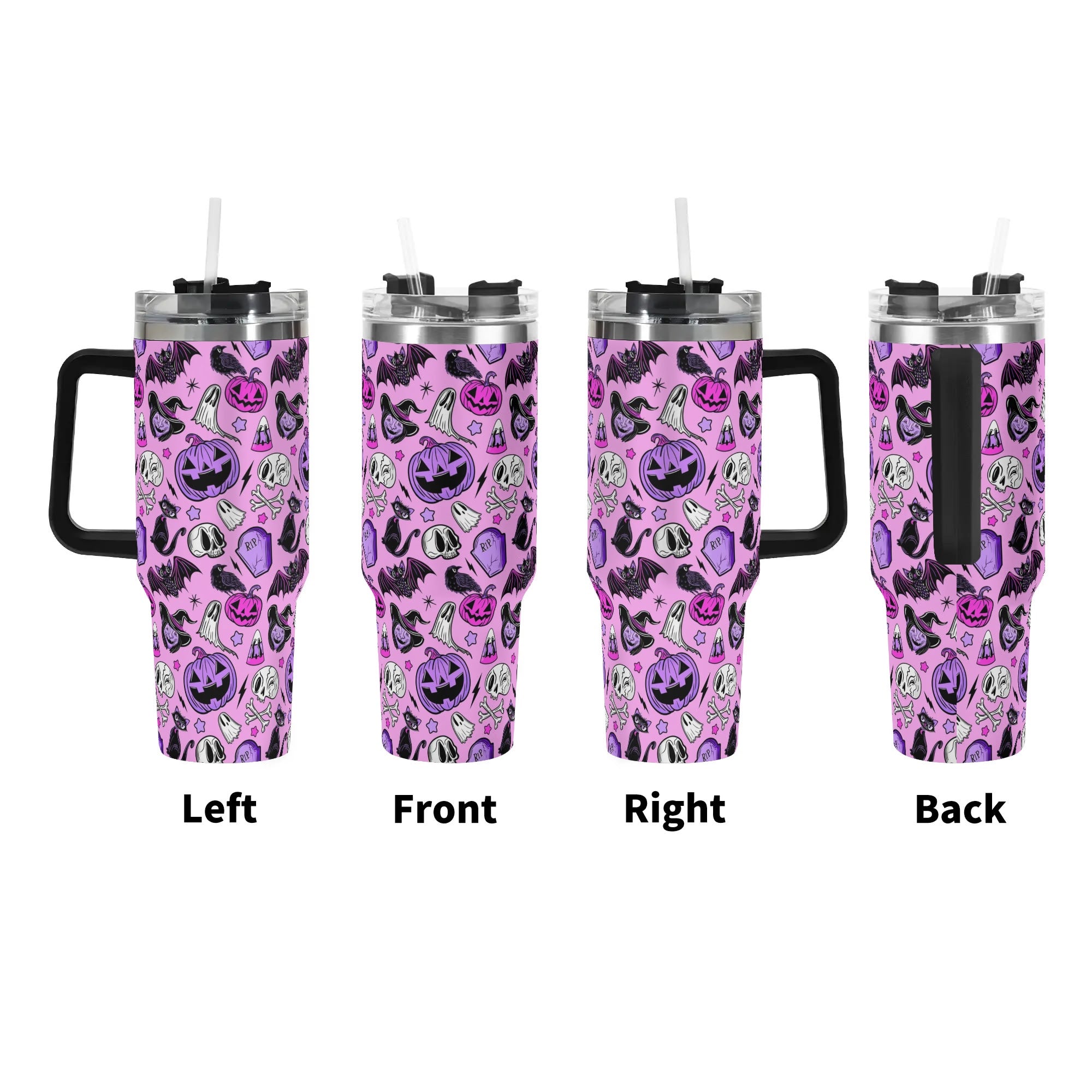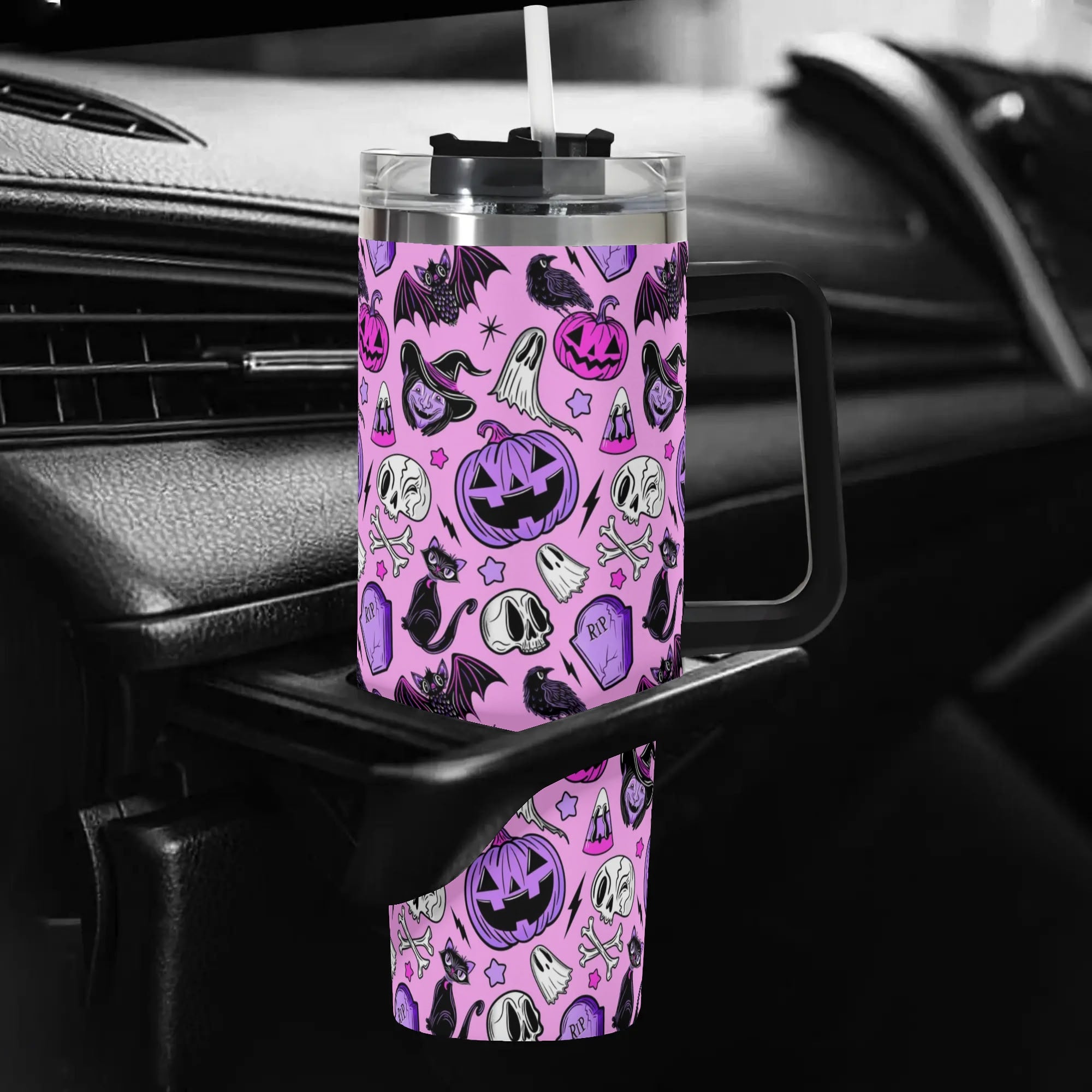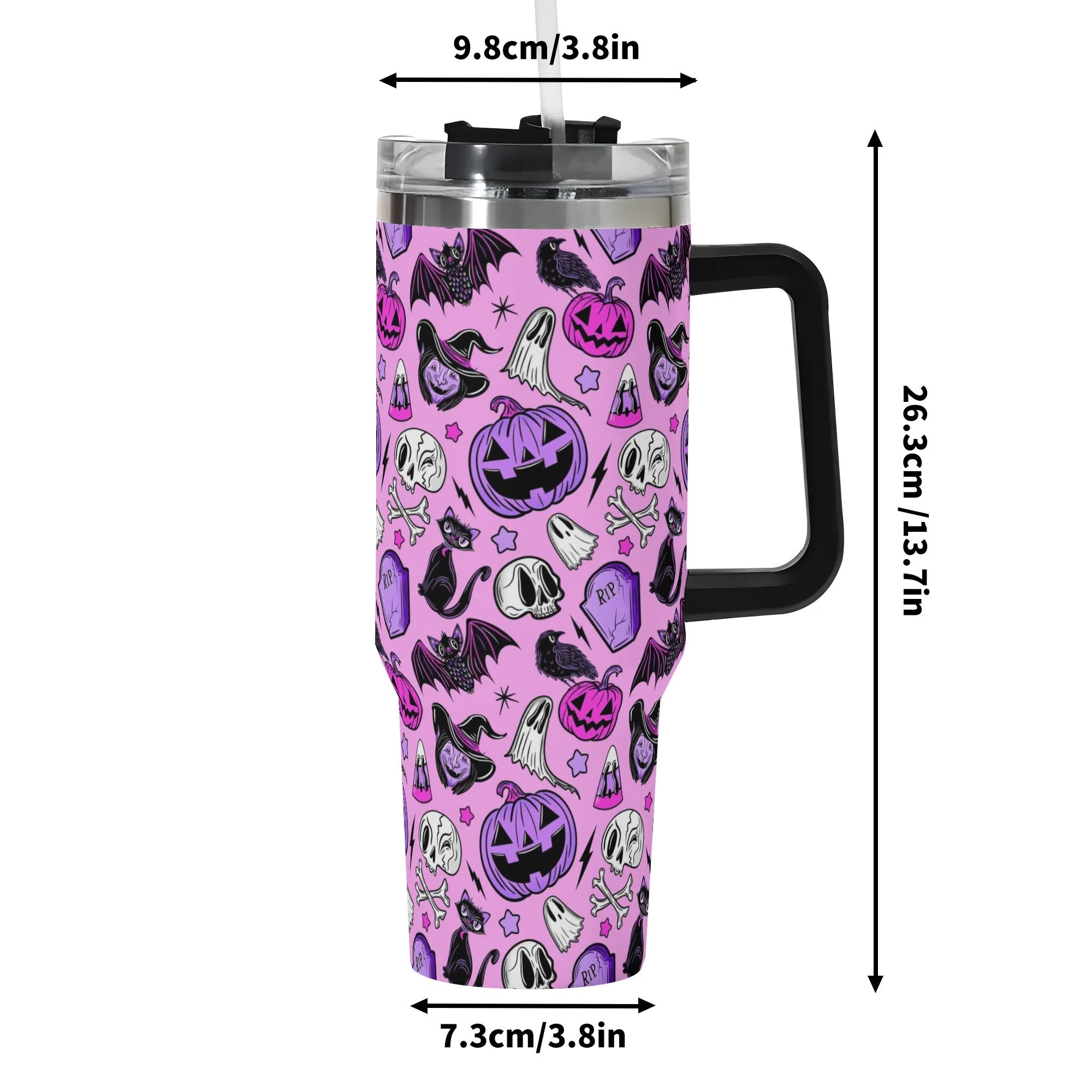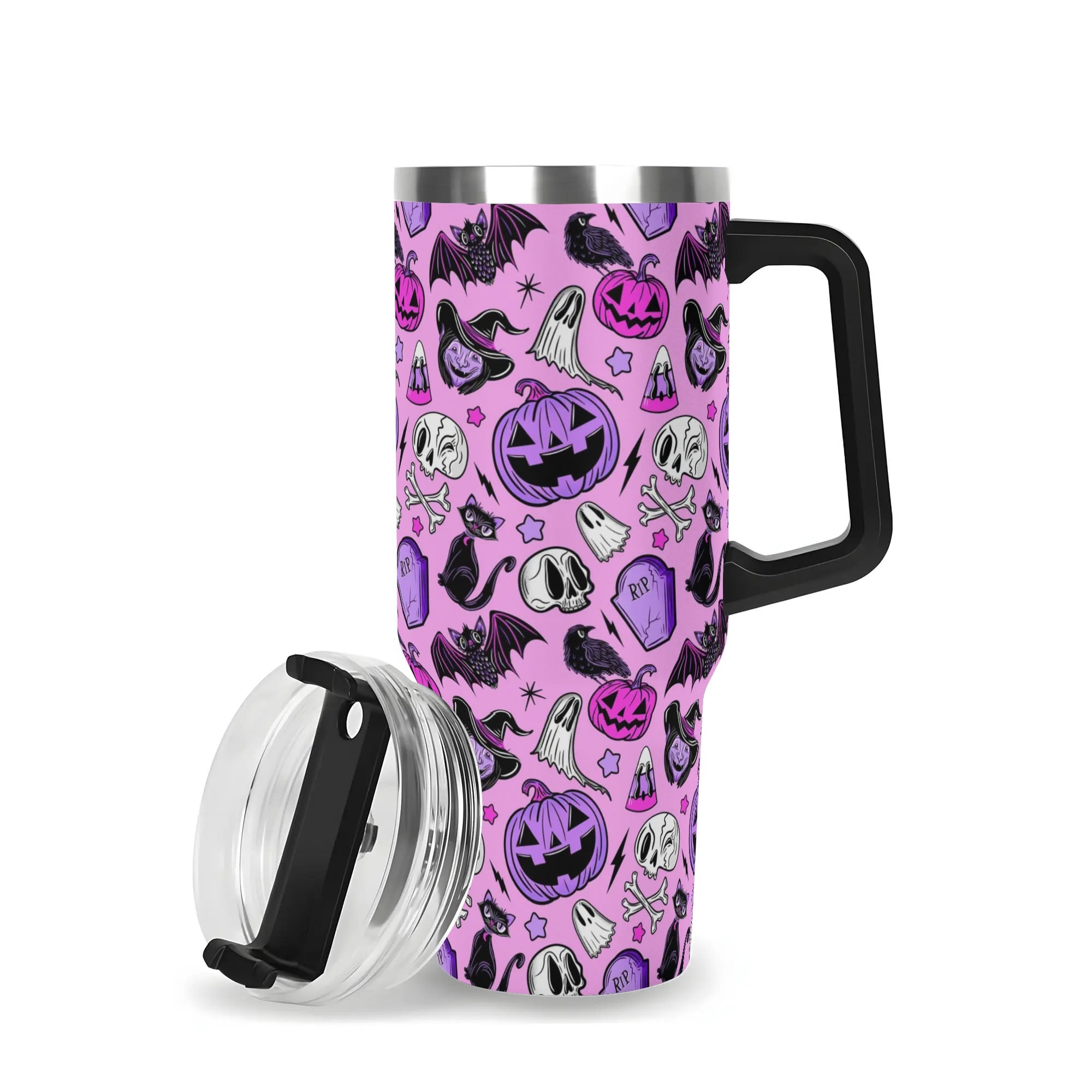 Stay festive on-the-go with this spooky Halloween-themed travel mug. Featuring a secure lid, handle, and straw, it’s perfect for hot or cold drinks.