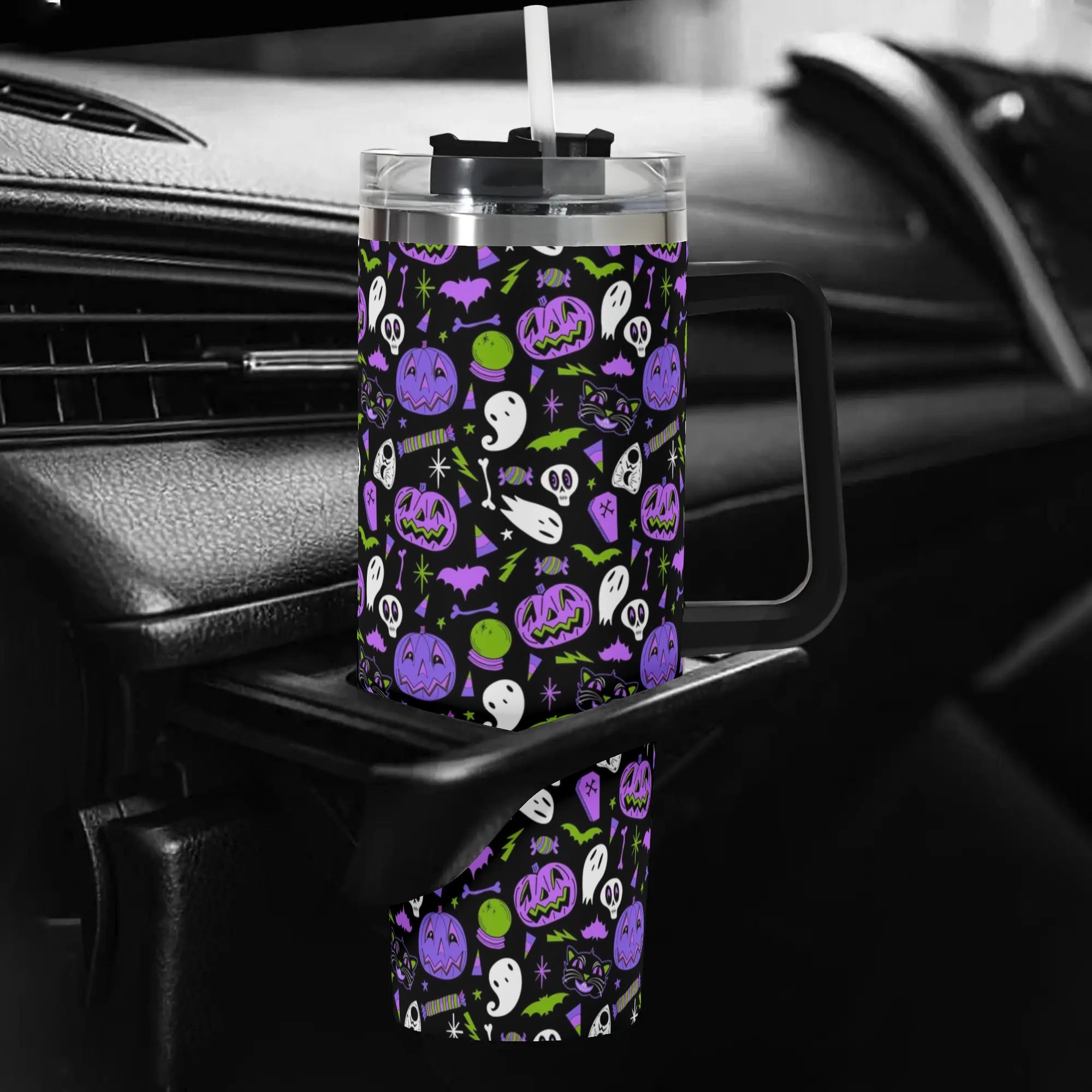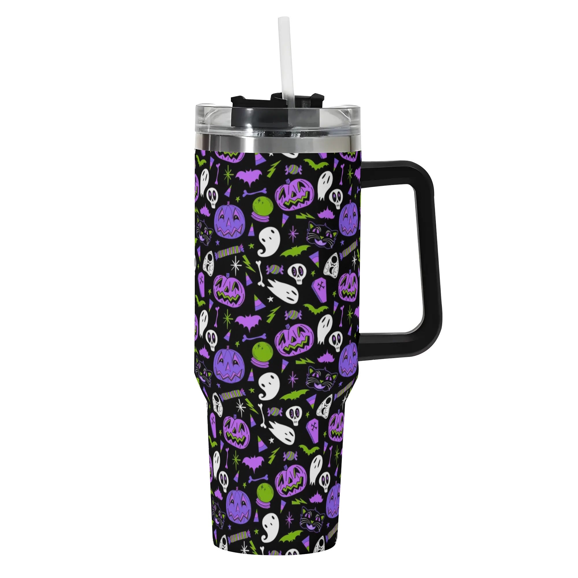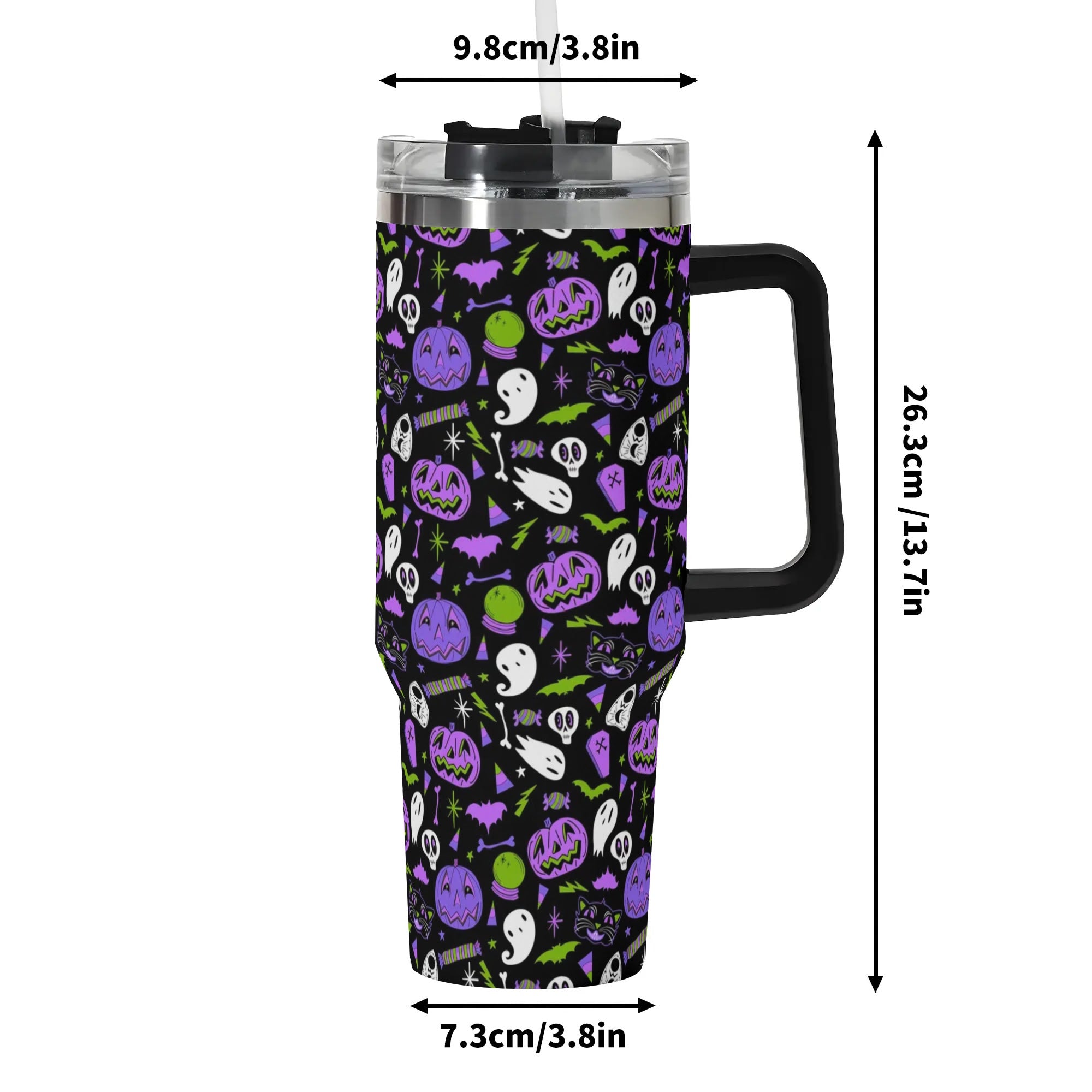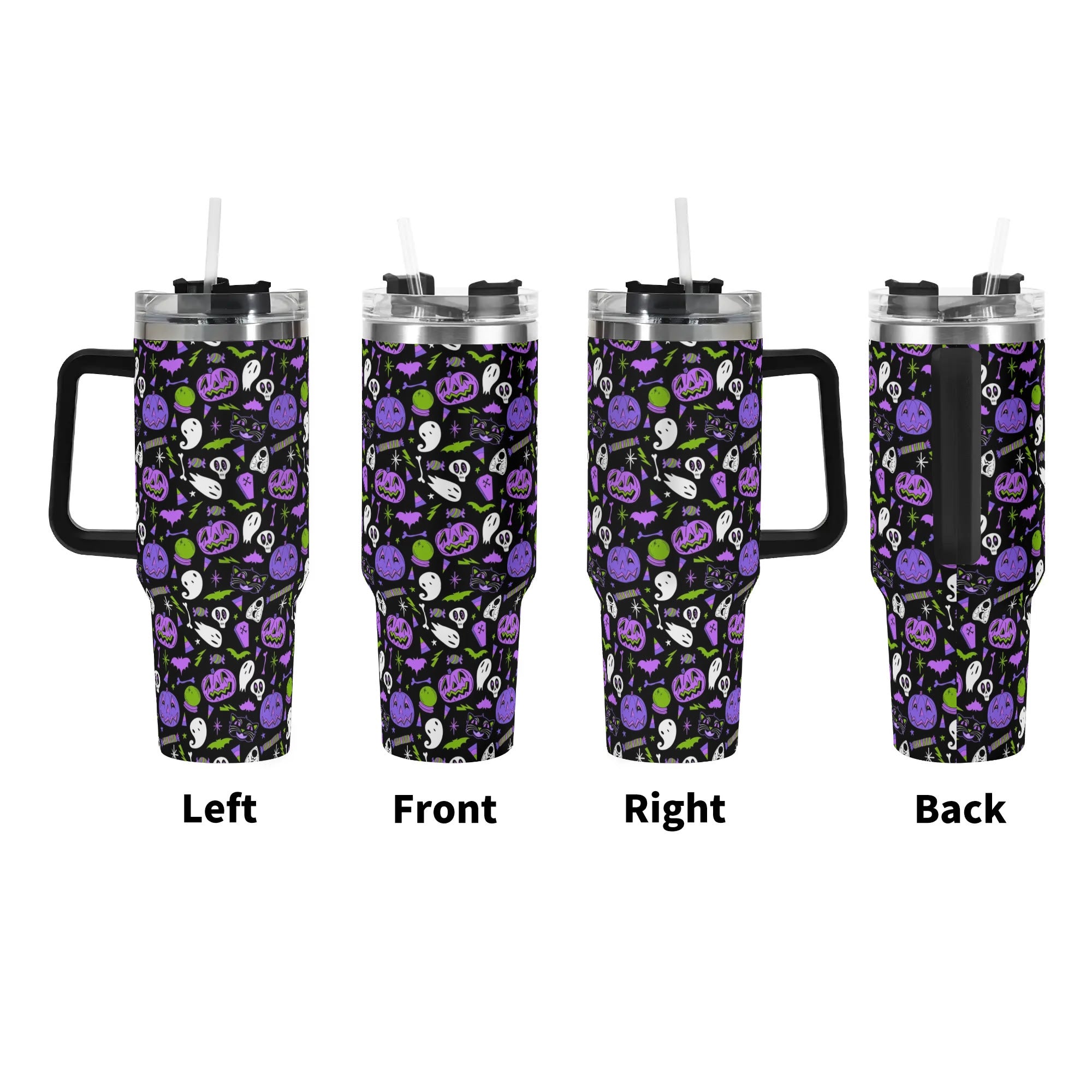 Embrace the Halloween spirit with this spooky-themed travel mug. Perfect for keeping your drinks hot or cold on the go. Durable and stylish!