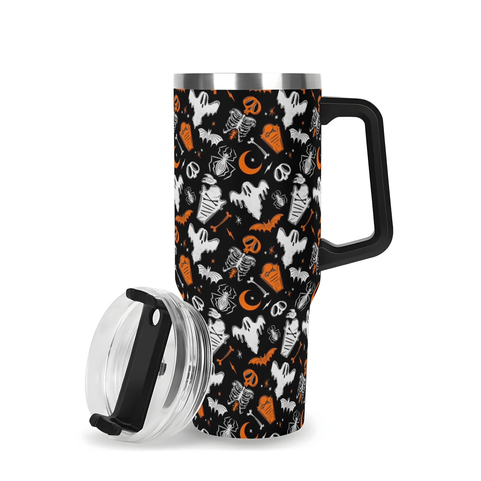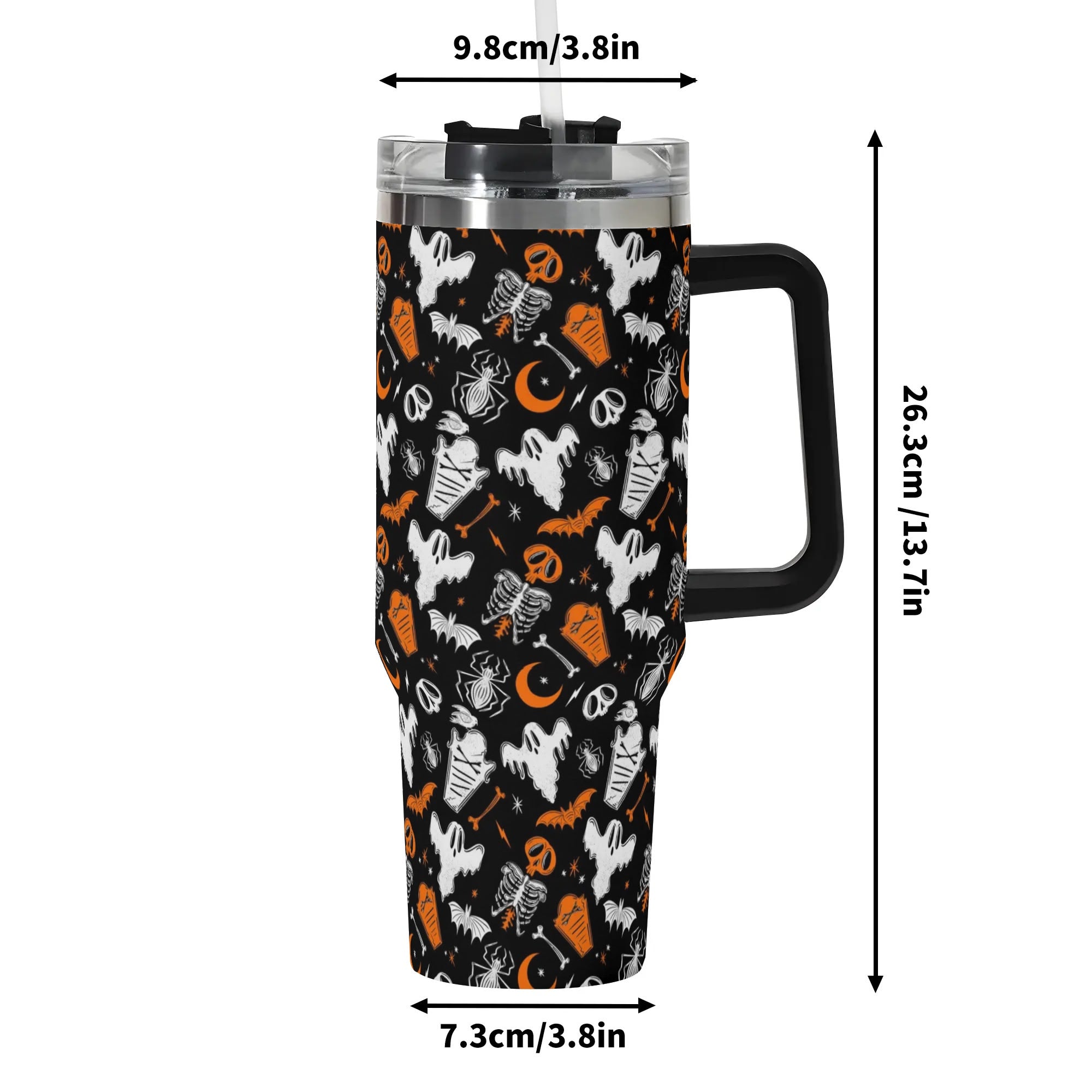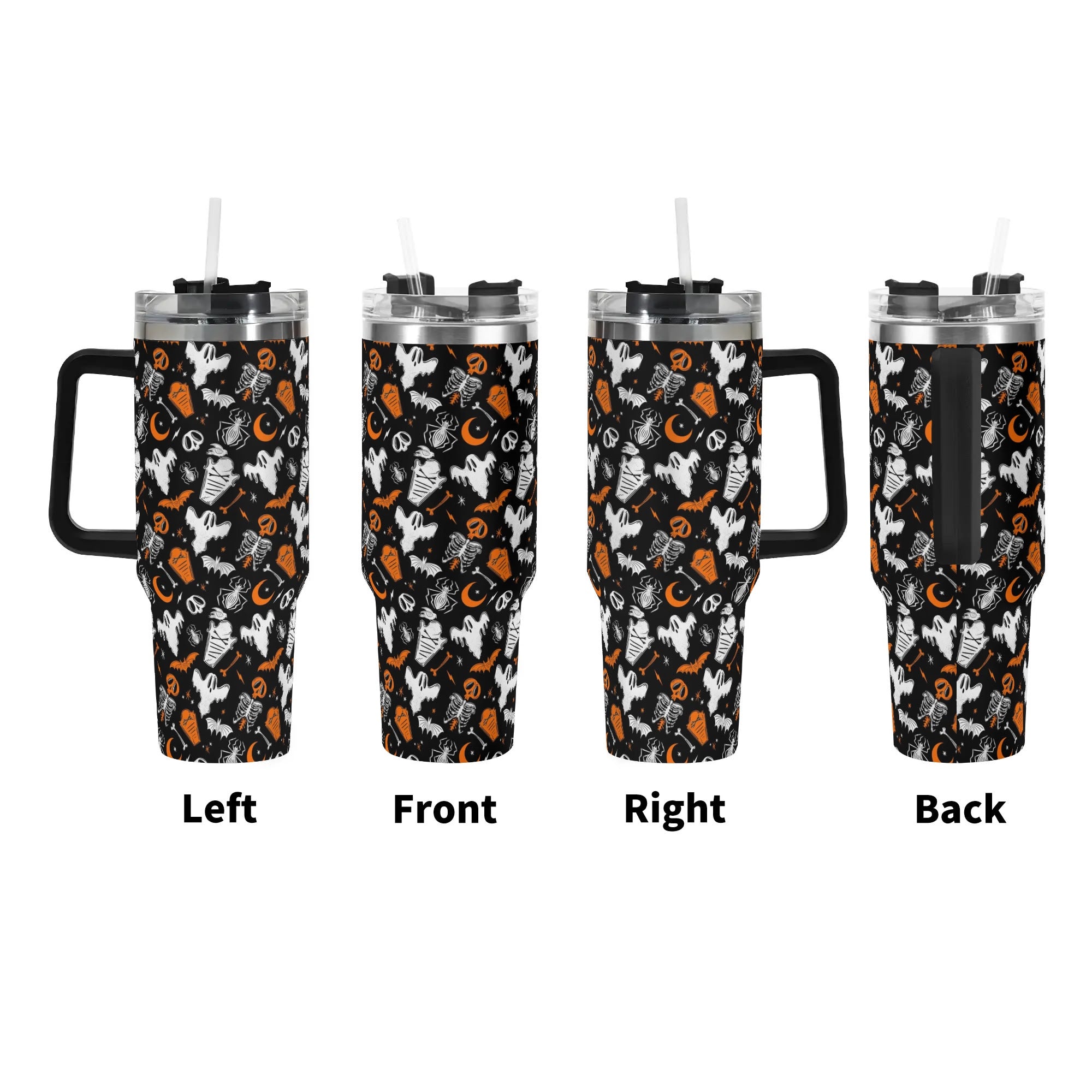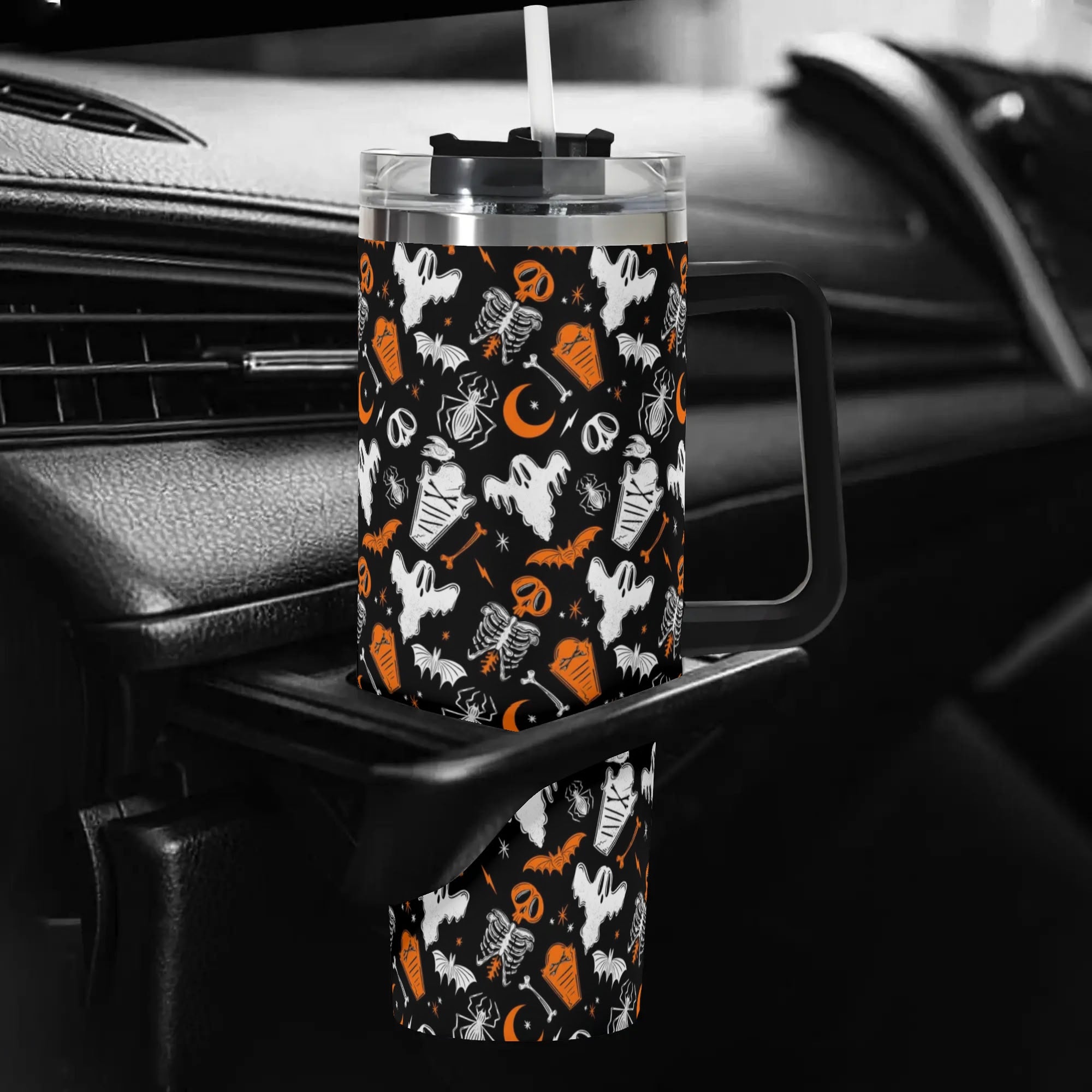 Keep your drinks festive and fun with this Halloween-themed tumbler featuring a spooky design of ghosts, bats, and skeletons. Perfect for on-the-go sipping!