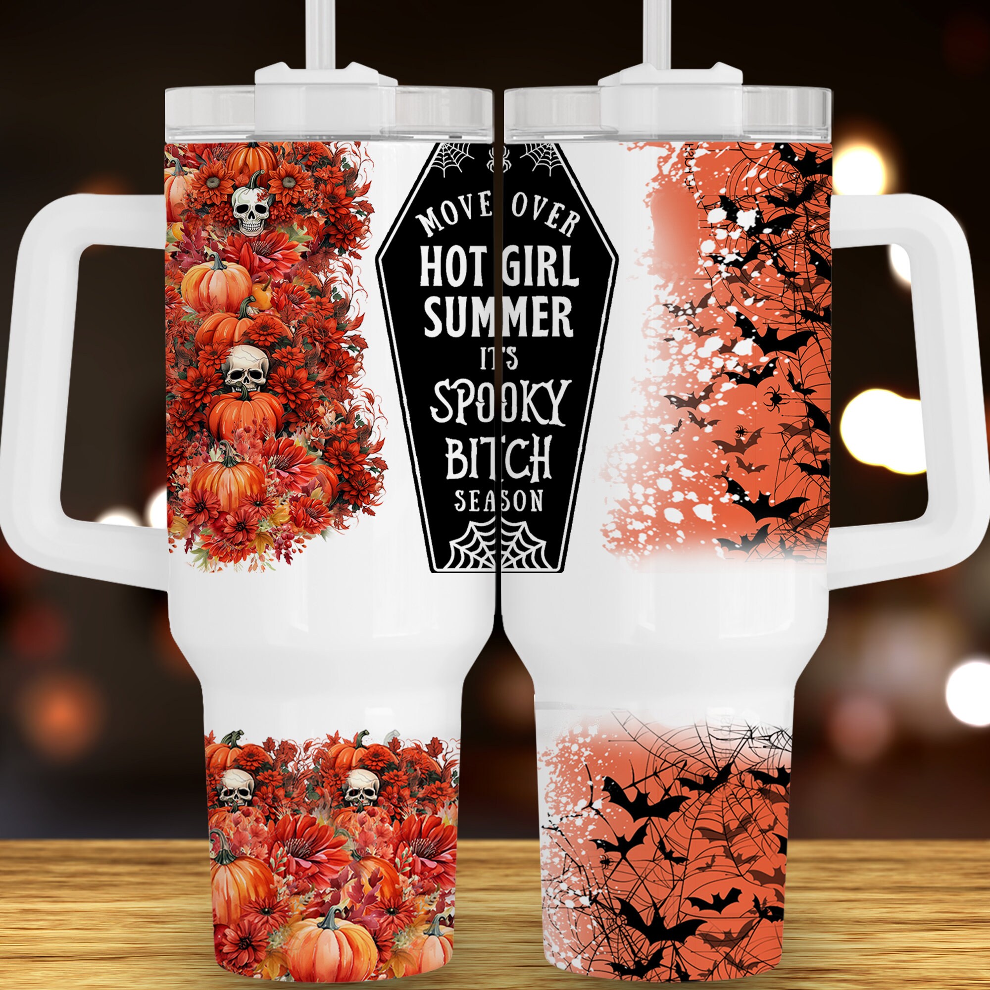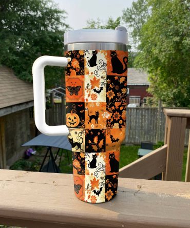 Embrace spooky season with this vibrant tumbler featuring skulls, pumpkins, and bats. Perfect for Halloween vibes and keeping drinks cool.