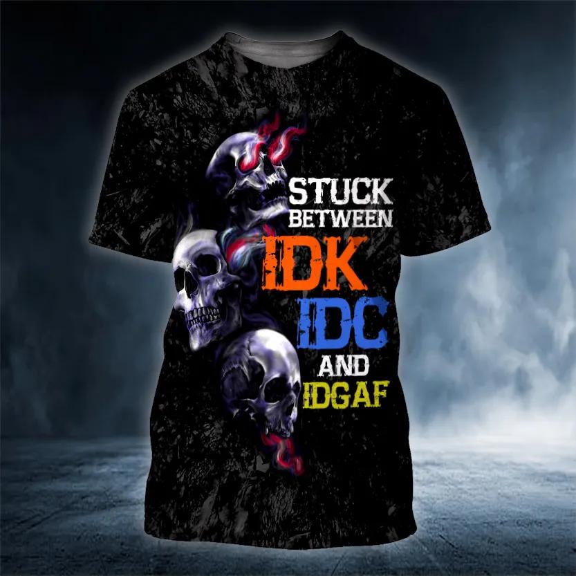 The Stuck Between IDK IDC IDGAF Skull 3D T Shirt also features a unique skull design that?s sure to turn heads. The skull is printed in vivid colors that pop against the black fabric of the shirt. The design is also carefully detailed and has a realistic look that will draw attention.Are you ready to take your wardrobe to the next level? Look no further than our 3D Skull T Shirt Collection! Our collection of 3D Skull T Shirts are sure to turn heads and make a statement. Made with high-quality materials, these shirts are comfortable and breathable, while still giving you the edgy look you’ve been searching for.Features:Best material:?Four-way stretchable fabric (95% Polyester + 5% Spandex) ? This fabric provides elasticity, softness, breathability, and durability ? suitable to complement your casual styling or accompany you on your active day. Plus.Customization:?We make 3D Tshirt on demand, create stunning designs and start selling your unique All-over Print Comfort T-shirt nowGift of Love:?A perfect idea if you are finding a birthday gift, a festival gift, Father?s Day, Valentine?s Day Christmas gift for your family member, friend, coworker, roommates. A wonderful way to honor the memory of a special person or milestone.Garment Care: Machine wash or hand wash. Tumble dry on low heat. Avoid direct heat. Do not use bleach.Customer Support:If you need any assistance, you can contact us directly on the website via Chatbox, or send us a notice via email to: [email protected]