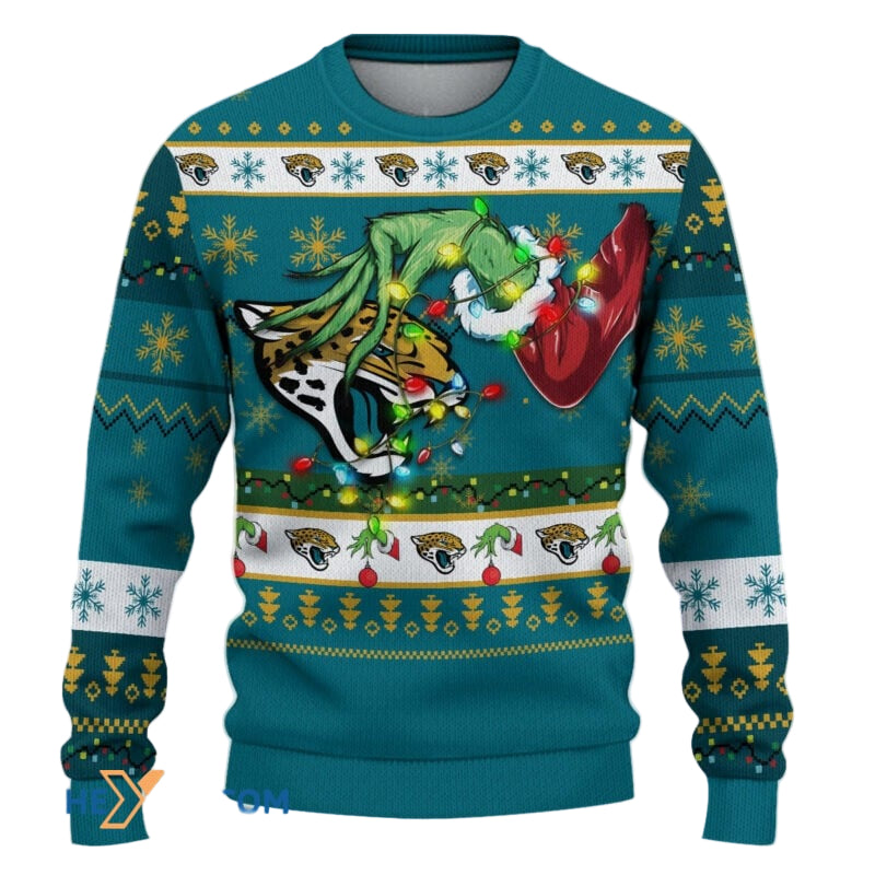 Ugly Christmas Sweater Jacksonville-Jaguars, Go Jacksonville-Jaguars Grinch Christmas Snowflakes Teal