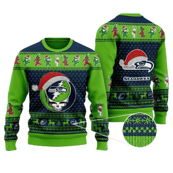 Ugly Christmas Sweater Seattle-Seahawks, Skull Blue/Green